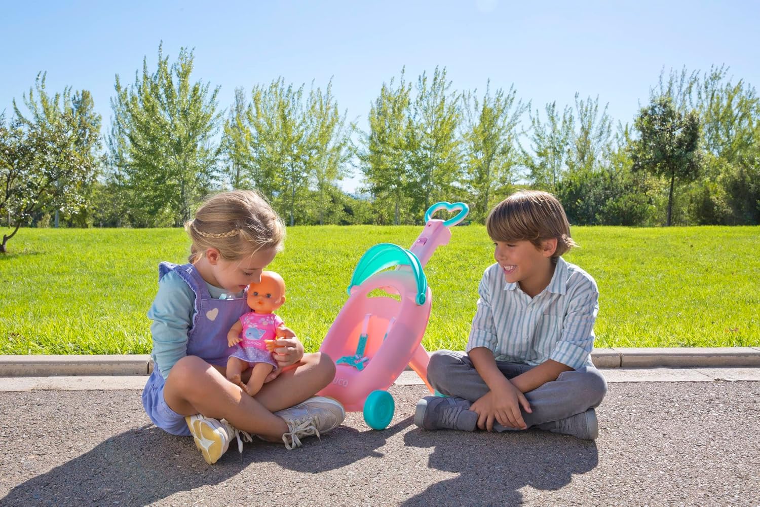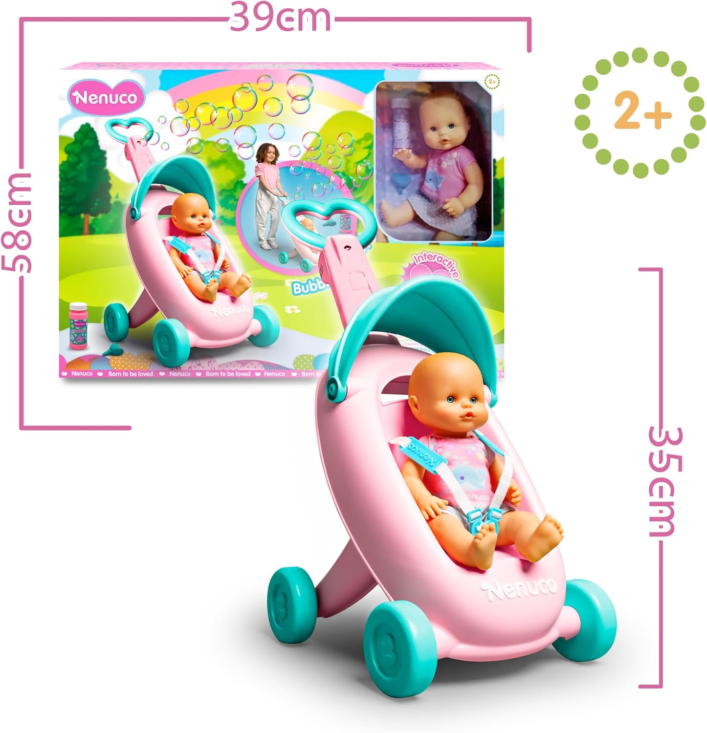 The beautiful blue and pink bubble stroller with a heart shaped push handle blows magical clouds of bubbles as you push baby along! The playset inlcudes a dolphin shaped funnel so you can pour in the included bubbles into the stroller. The bubble stroller is ideal for 35cm and 42cm Nenucos.