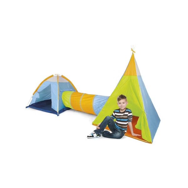 Polyester fabric, stable lightweight PE floor, T-door with Velcro closure, plastic rods (Indian tent), fiberglass rods (igloo), polyester storage bag, crawl tunnel: polyester fabric, spiral spring rods. Transform this garden toy into a real Indian camp. Tent dimensions: