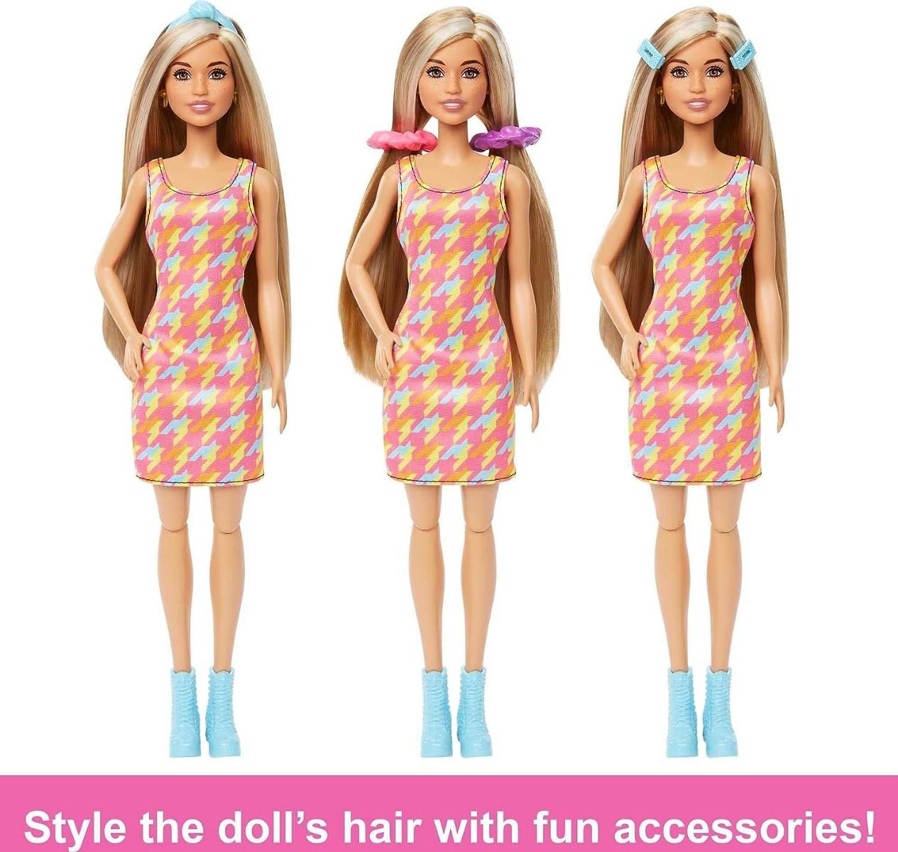 Barbie doll has 6 inches of long and playable color-change hair. She models a colorful houndstooth-print dress and blue boots!