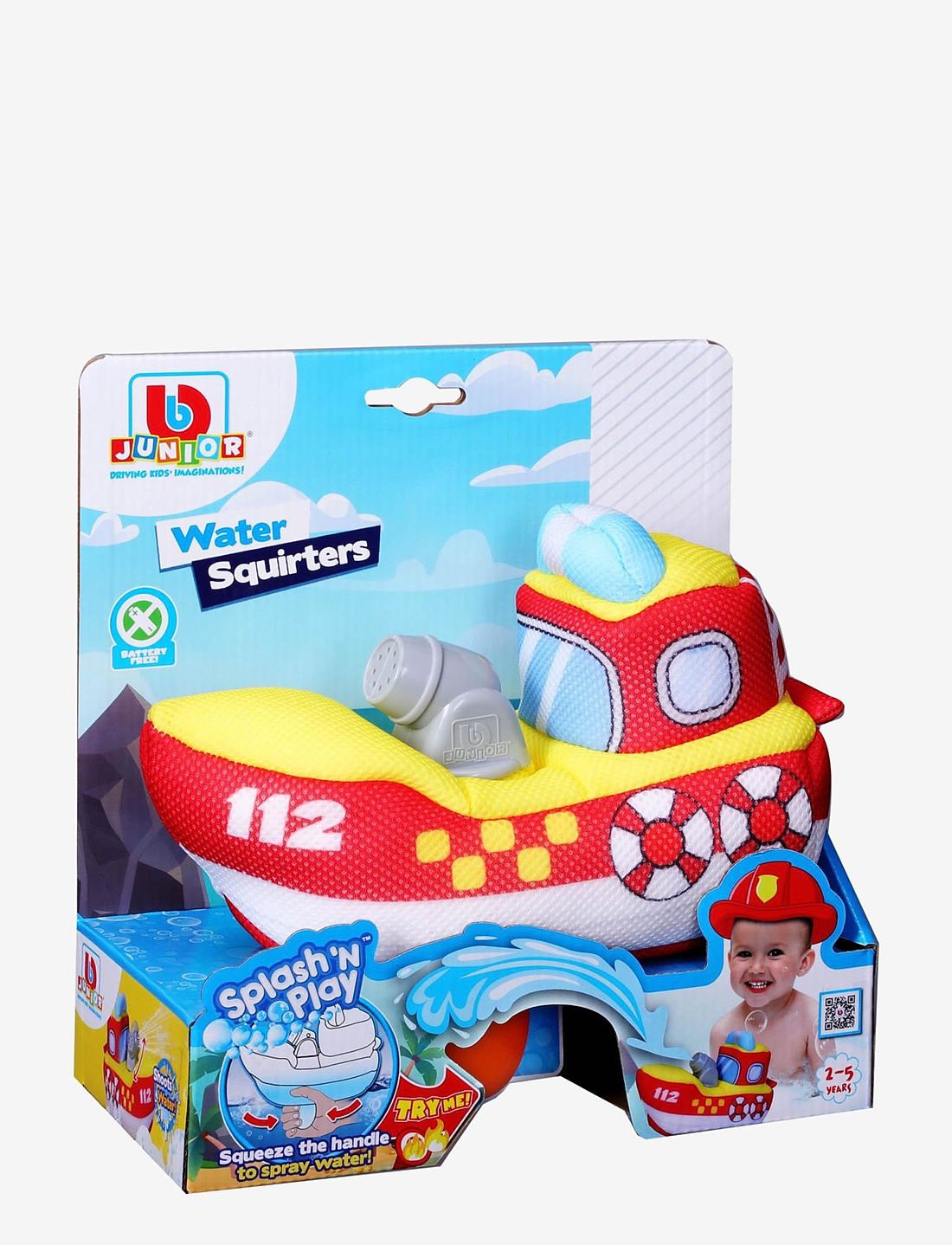 The fire boat is ready to keep the waterways safe from any blazing objects. Simply press the handle, aim at your target and splash! The boat shoots water. Made from sandwich netting fabric, the boat drains quickly and dries fast. Length of boat 21 cm. From 24 months.