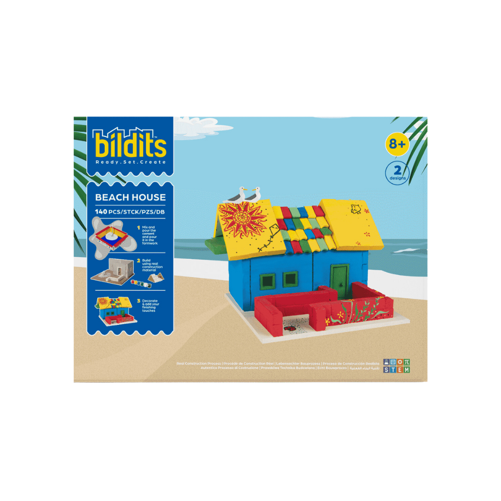 Beach House is part of the Bildits Pro Series. With these kits, young creators can start thinking and constructing more efficiently using precast walls designed to help level up their skills. Gain a unique understanding of modern construction methods by learning about precast walls that include doors and windows using our specially designed molds. Learning how to install them equips creators with the skills to build larger, more complex structures, while stimulating a range of cognitive and motor skills in the process.