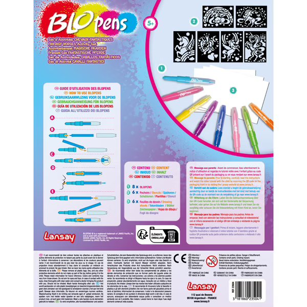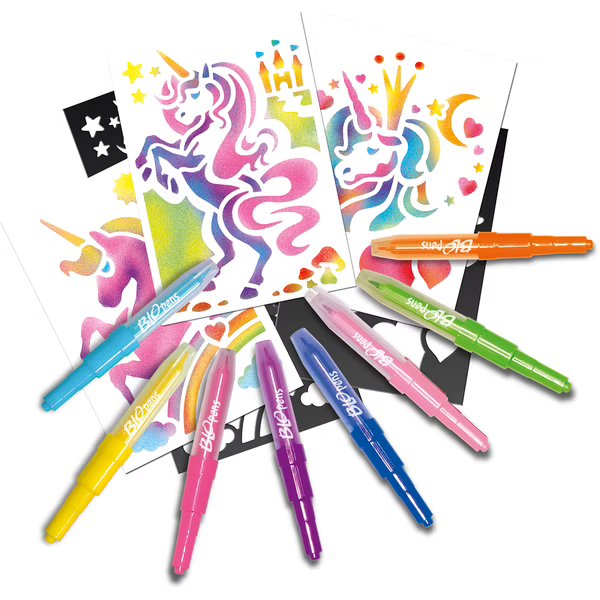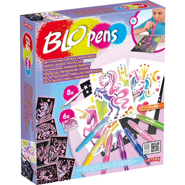 Create with this Blopens box , fantastic horse drawings : unicorns, Pegasus… Blopens are magic markers that allow you to easily create pretty drawings . Use a stencil , blow into the pen and watch your drawing appear. You can also color with the tip as with classic markers. Blopens , magic markers so appreciated by children who will be able to express their creativity by creating magnificent drawings .