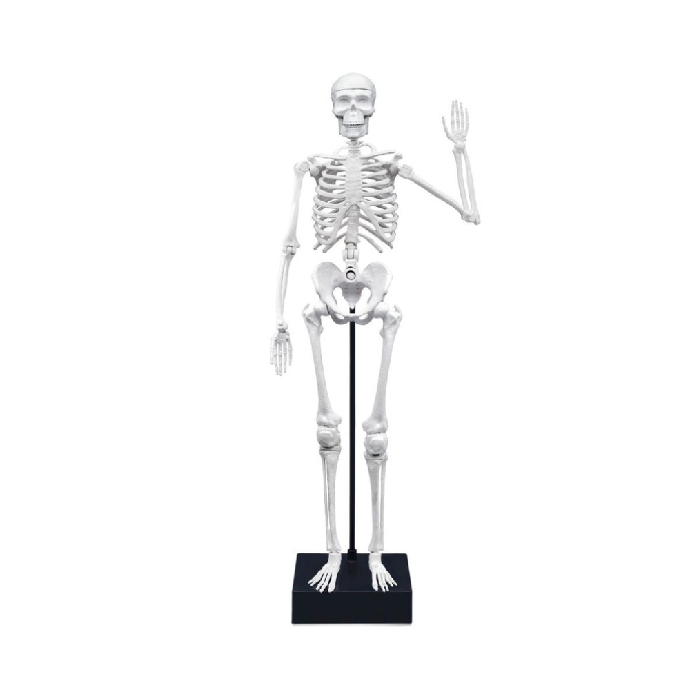 Assemble the skeleton to discover anatomy. The bones have realistic texture and color. The skeleton is fully articulated and the child can move it in different positions. A base is provided to display it on a desk.