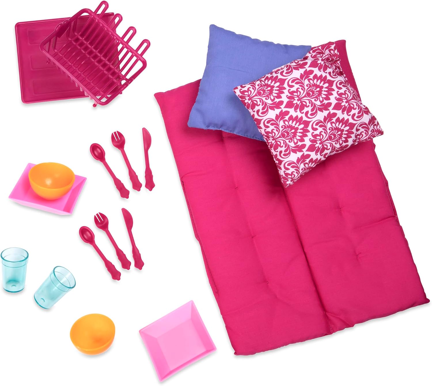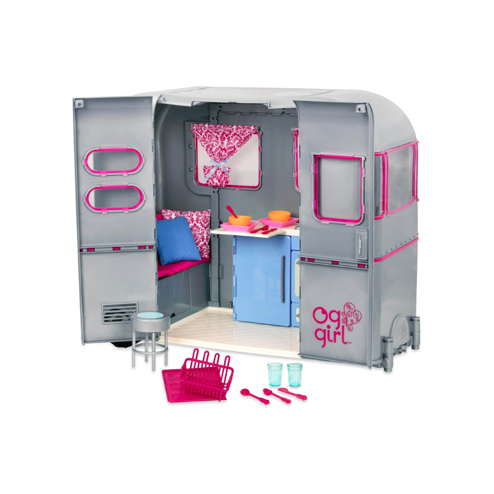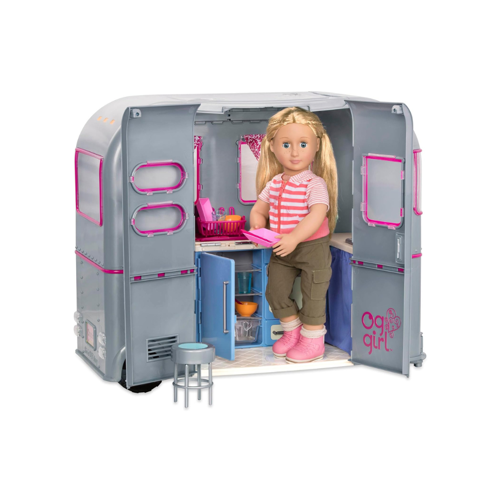 This sturdy camping trailer will be a second home for your travelers on the road. Fully equipped with all the comforts, your dolls can cook up some fun in the kitchen. It features a mini fridge, sink, and opening stove, and they can keep everything neatly organized with the storage shelves! The table top easily slides out for more dining space, and you can set up the 2 stools outside the camper to enjoy delicious meals in the fresh air! When it’s time to rest for the night, grab the soft mattress and fold out the dining bench to create a comfy bed – it’s the perfect size for your dolls to dream sweet dreams. The rolling trailer also includes a hitch that easily attaches to the Our Generation My Way & Highways 4×4 vehicle, so your dolls can set up their campsite all over the world! R.V. camping trailer for 18-inch dolls Bench folds out into a cozy bed so your dolls can dream sweet dreams Table slides out for more dining space Includes: camper, trailer hitch, mattress, 2 pillows, 2 stools, cutlery and tableware accessories Attaches to My Way & Highways 4×4 vehicle (sold separately) Compatible with most 18-inch dolls and accessories Suggested for ages 3+ (small parts) No batteries required Dolls sold separately