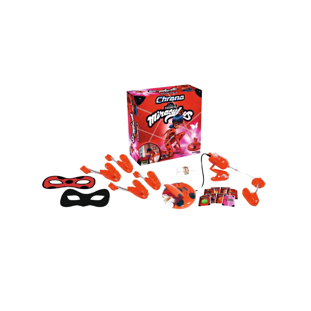 The box contains: 1 central Yoyo and sensor, 5 red clips and 1 clip with wire unwinder, 8 double-sided “scenario” cards, 1 cardboard Ladybug mask, 1 cardboard Chat Noir mask, 1 game rule and 2 butterflies.
