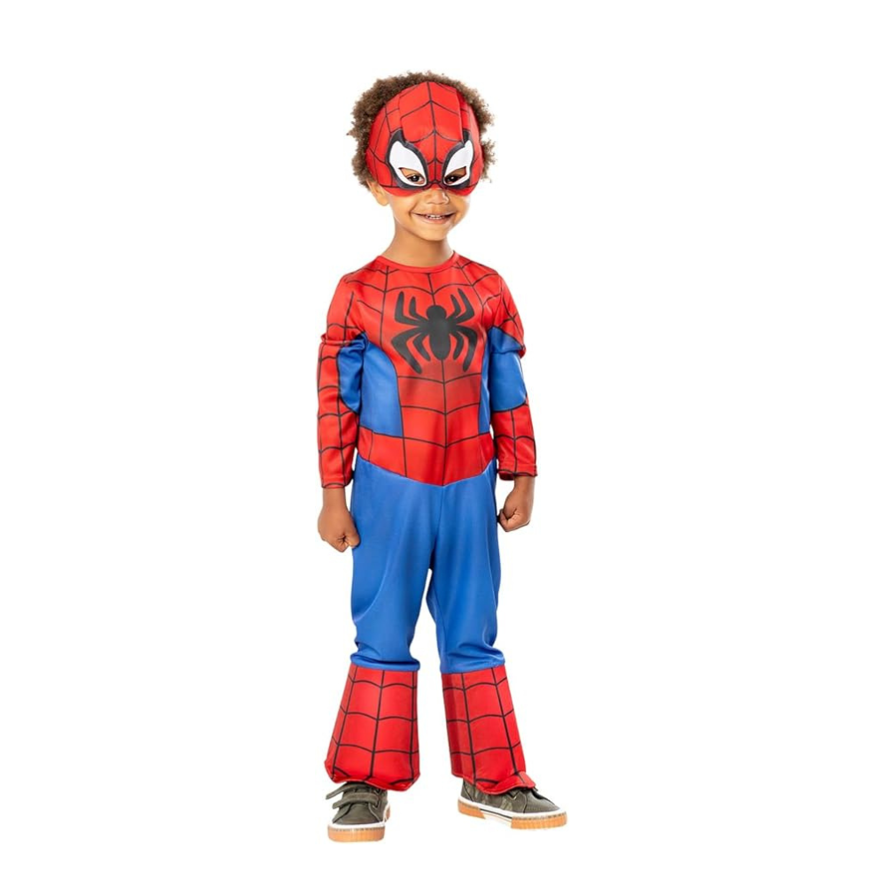 Swing into action with the MARVEL Spidey Official Toddler Boys 3T-4T Halloween Costume. Featuring a graphic design of Peter Parker’s classic suit, this printed jumpsuit includes padding in the chest and arms and closes with a hook and loop fastener. It also includes a fabric mask with a foam interior and an elastic strap.
