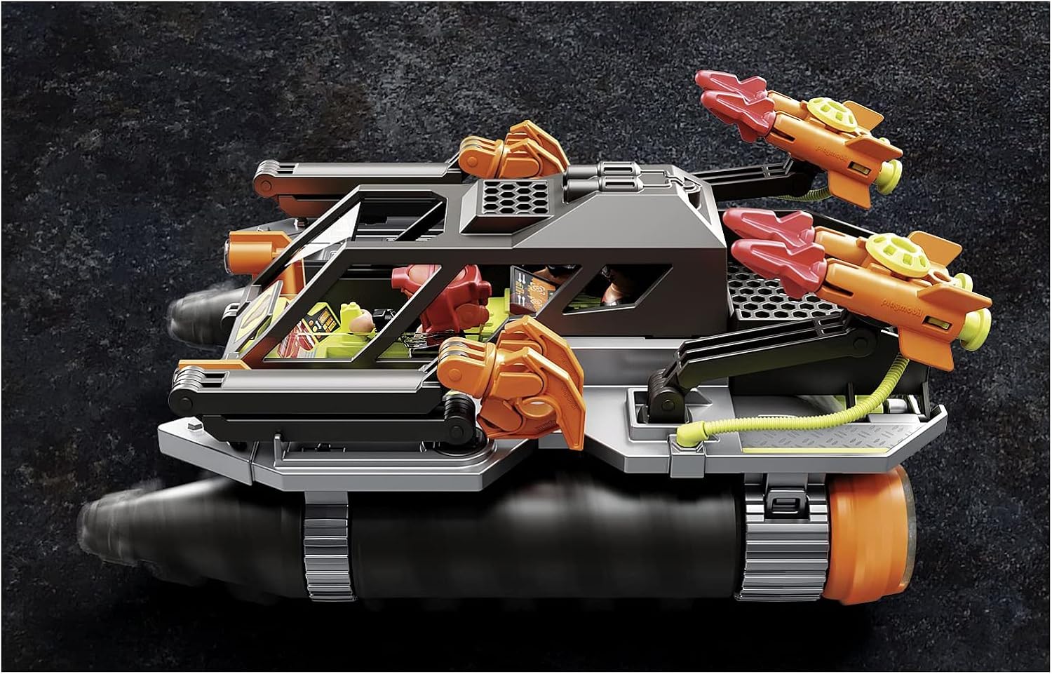 he gripper arms can collect and crack open boulders to reveal the energy stones within. There is no stopping them as they gather energy crystals to take back to their lab. Combine this set with the rest of the PLAYMOBIL Dino Rise theme (#70624-70629, #70925-70930 – sold separately) for even more dino-riffic adventures! Dimensions: 8.3 x 6 x 3.7 in. (LxWxH). Set includes Comet Corp. villains Ludmilla and Ralph, a miner figure, drill vehicle with grippers arms, four energy stones, hiding places, two double cannons with projectiles, and many other accessories. Recommended for ages five to ten years. Warning. Choking Hazard. Small parts. Not for children under 3 years.