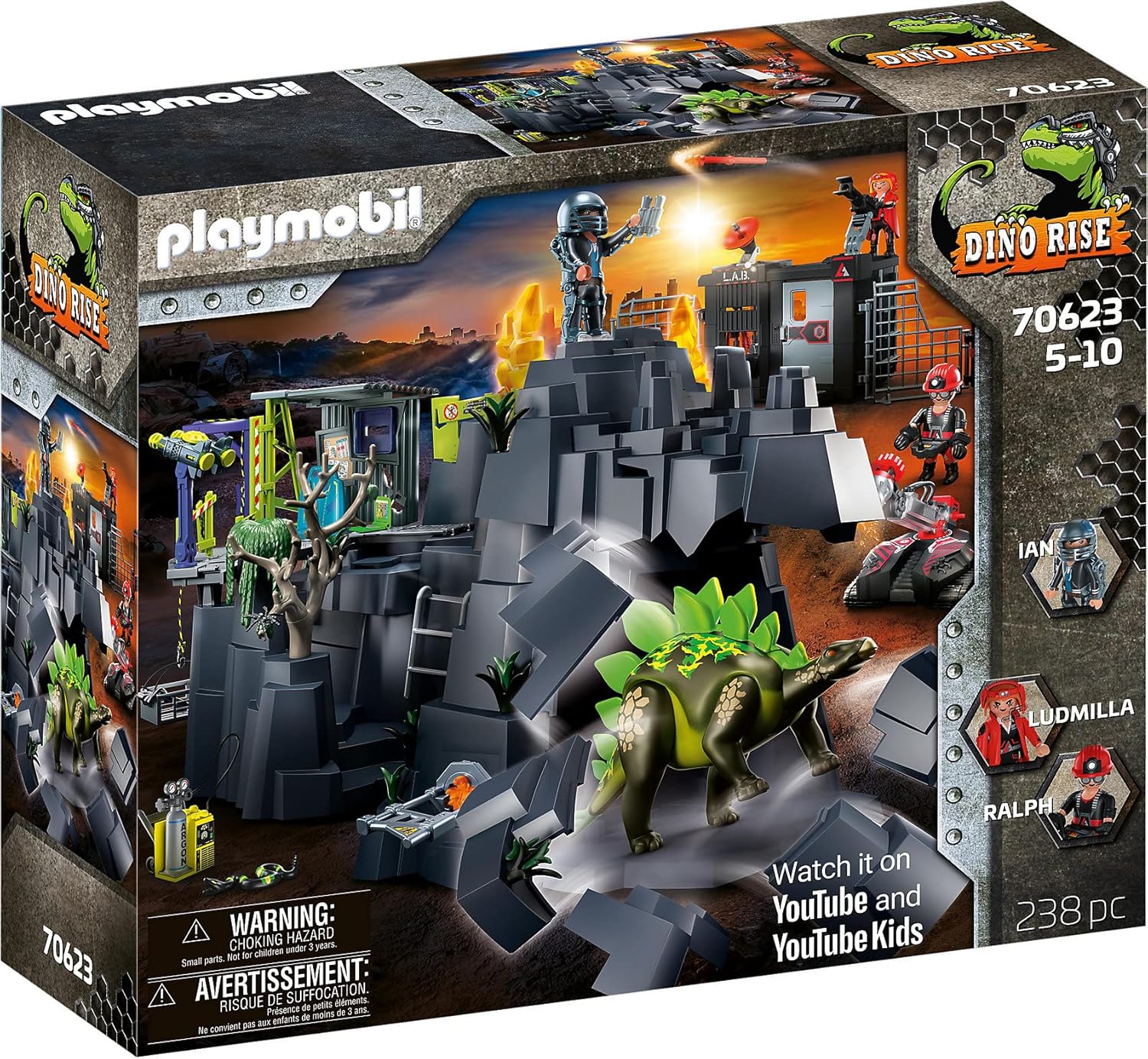 The Dino Rise team is gearing up for battle. The evil Comet Corporation is sending its ultra-modern battle robots to destroy the legendary Dino Rock. But Team DINO RISE won’t let them! Uncle Rob and Milow are working on special protective gear so that everyone and their dinos can face the enemy together. By now, the teenagers have managed to set up camp at Dino Rock. The Rock features a freight lift, a cannon, a bridge and a slide as an emergency exit – that way Ian can easily spot the enemies. He is working on a plan to free the Stegosaurus. Will he succeed without Ludmilla and Ralph from the Comet Corporation discovering him? And what happens when they get their hands on the portal stones in front of him? Authentic dinos, sophisticated equipment and good and evil PLAYMOBIL figures bring dino adventures to life – perfect for all adventure-loving dinosaur fans.