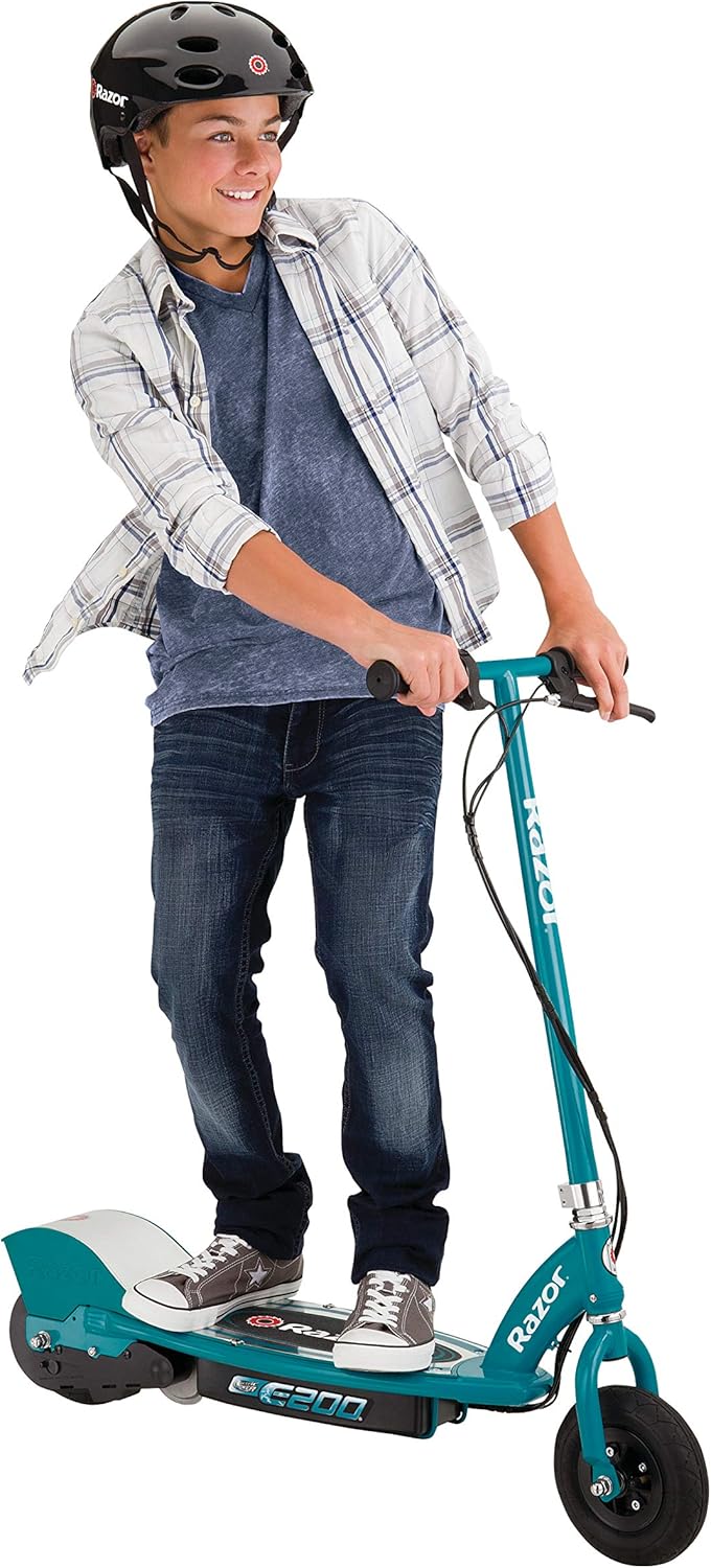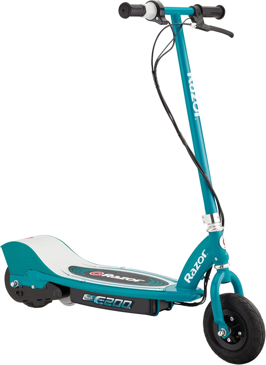 Graduate to a bigger ride with the E200 electric scooter and its full-size deck and frame. Designed for riders ages 13 and up, the E200 matches its bigger size with its powerful, 200-watt, high torque, single-speed, chain-driven motor to thrill older riders. Hitting speeds up to 12 mph (19 km/h) for up to 40 minutes of continuous use, the E200 is perfect for a solo adventure or a cruise with friends, with the range to tackle both. The E200 features an all-steel frame and fork for durability, while the 8”.(200 mm), pneumatic front and rear tires help take the bite out of rough surfaces. And, with its twist grip acceleration control and hand-operated, rear brake, the E200 puts power and control in your hands