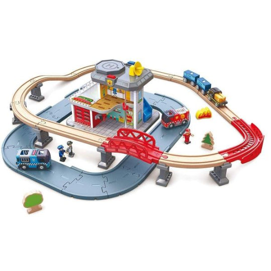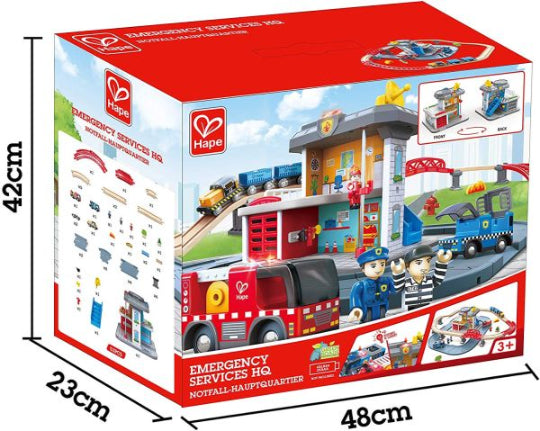 Hape’s Emergency Services HQ is a realistic emergency HQ with road and rail tracks. It includes one station building, one opening bridge, one pylon bridge, a fire engine, a police car, three figurines (police officer, fire fighter and criminal), a two-carriage freight train, 14 road tracks, and 10 wooden rail tracks. With so many pieces, the fun begins in assembling this realistic emergency services set. Once assembled together, get ready to start keeping the roads and railways safe. Have the police catch the robber and put him in jail. Then send the fire brigade out to put out the flames. The HQ has a jailhouse and a garage for servicing the vehicles. The jailhouse door opens to put the baddy behind bars. The HQ roof has a working siren and flashing light. These little extra touches are what keep the little ones enticed all day long. Develop Emergency Services Knowledge This kid’s toy features police and fire brigade headquarters and vehicles. This means while your little one is having fun, they are developing their problem-solving skills, social skills, exercising their creativity and imaginative powers, improving hand-eye coordination, improving dexterity, and sharpening their knowledge of emergency transport systems. Suitable for ages three and above. Like all Hape Kid’s Toys, the Hape Emergency Services Set is made from non- toxic, kid friendly materials. The road tracks made from Green PE which is a plant plastic made from sugarcane.