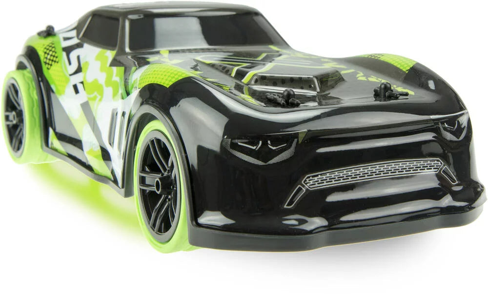 Featured with LED lights and sound effects, 4WD Battery car toy runs fast, and it will be bright when moving in the day and night. Creating endless fun for kids with it’s black paint and bold green graffiti.