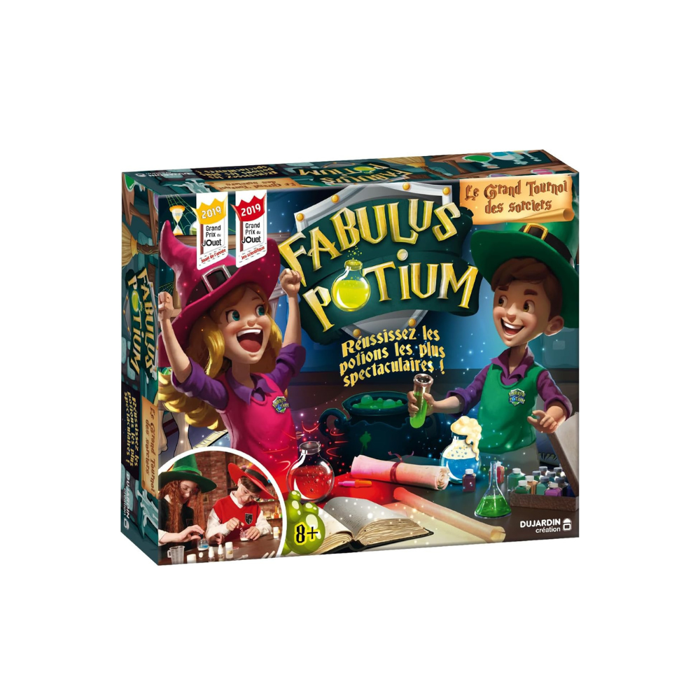 The box of this educational set contains 2 transparent cauldrons with stoppers as lids. There is also 1 grimoire with the different potions, 2 pairs of protective glasses and 2 pipettes. For pre-mixing, the box consists of 2 beakers, 2 measuring spoons, pH papers and decorative labels.