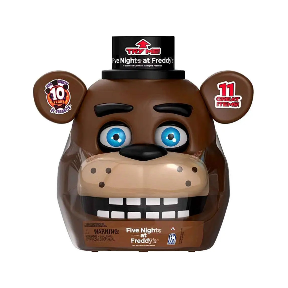 Its a frighteningly fun time with the Five Nights at Freddys Animatronic Freddy Bundle, from the hit game! The Freddy Case features light-up, opening and closing eyes and freaky sound effects, making it a must-have for any Fazbear fans. Open up Freddys head to find an instant collection, with 10 great items, including a Poster, a Sticker Sheet, 2 Microfigures, 3 Trading Cards, and 3 Exclusive Mystery Plush, only available within this bundle. Pickup your Five Nights at Freddys, Animatronic Freddy Bundle today!