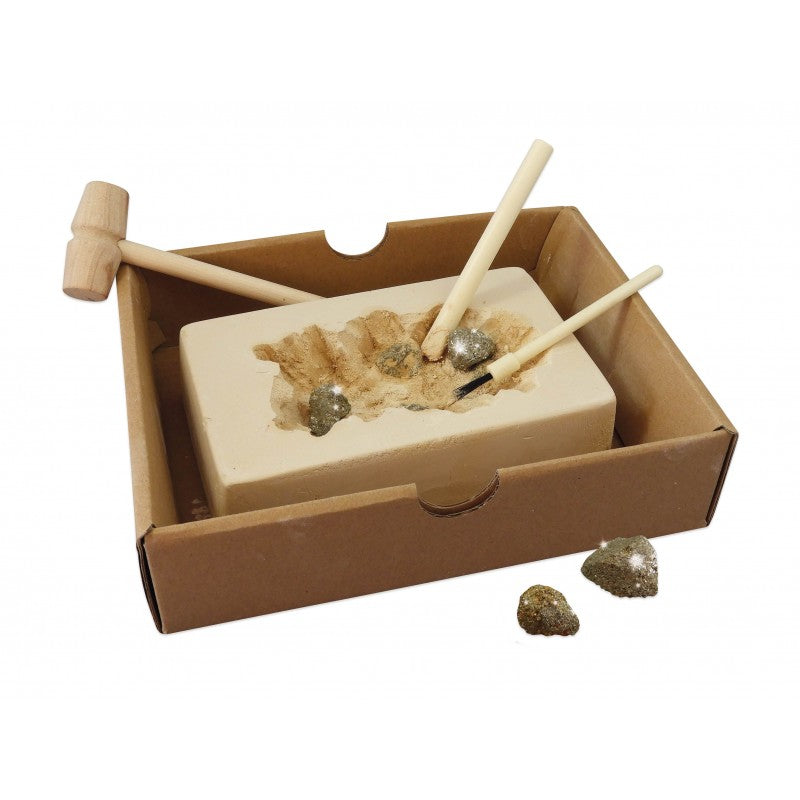 Two gold prospecting techniques to discover: panning to separate gold from sand and mining to dig up nuggets of fool’s gold.