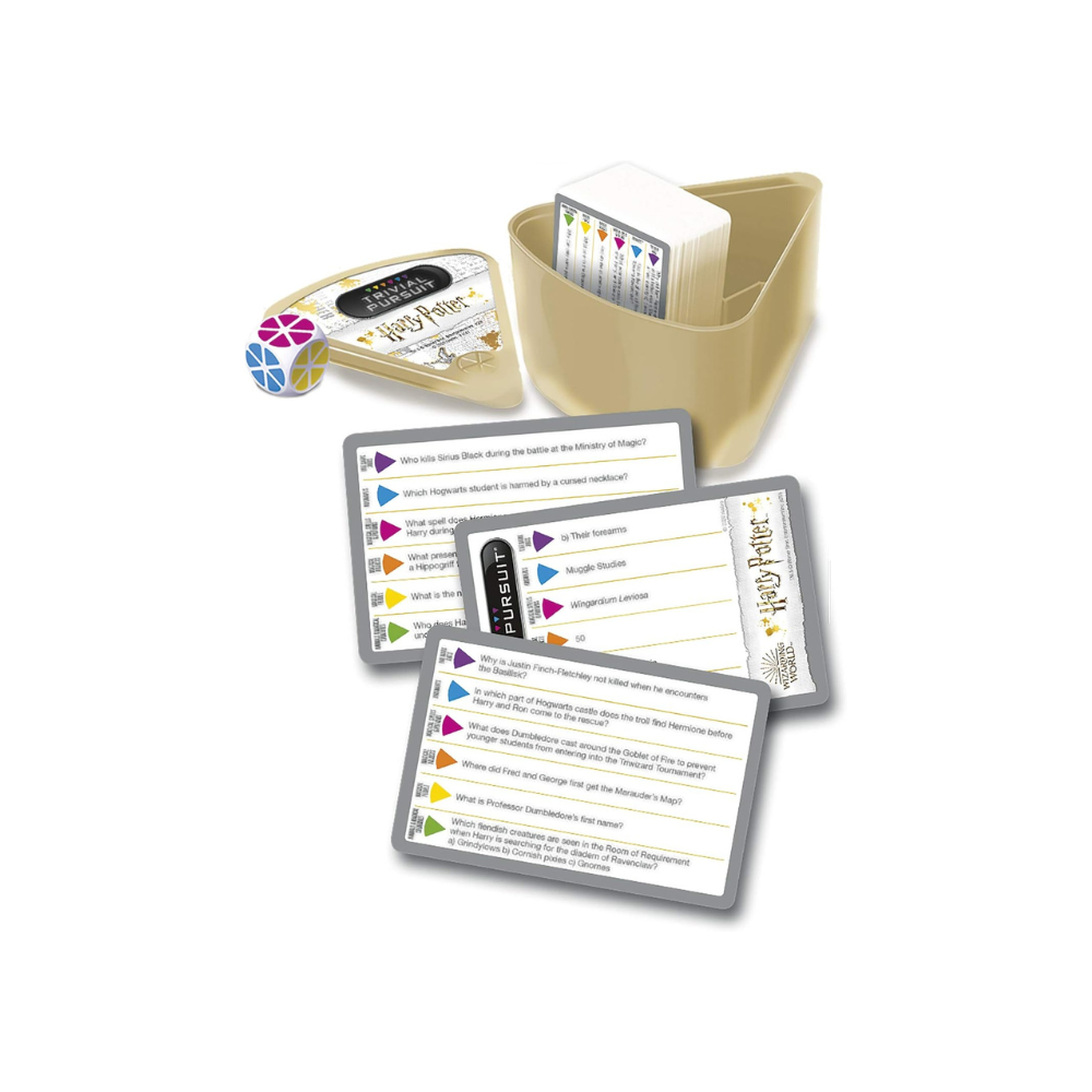 This compact and quick-playing edition of the Trivial Pursuit game includes 600 trivia questions about the magical world and beloved characters of the Harry Potter movies. Some questions might challenge even the wisest of wizards! What is the Trace? What is Krum’s first name? How many brothers does Ron have? Face the challenge with these and other trivia questions in 6 categories.