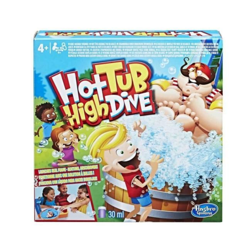 Pour the included demo bubble solution into the tub unit, spin the spinner, then press the big red button the number of times shown to send the diver up or down the ladder. Every press of the button increases the amount of foam in the tub. Once the diver reaches the top of the ladder, he will fall into the tub, launching a ball of suds at the unlucky player. The only player not to cause the diver to fall and the foam to fly wins the game. Entertain your kids with this easy-to-play board game. The Hot Tub High Dive Game also makes a great birthday gift, or holiday gift for pre-schoolers and kids 4 and up. Hasbro Gaming and all related terms are trademarks of Hasbro.