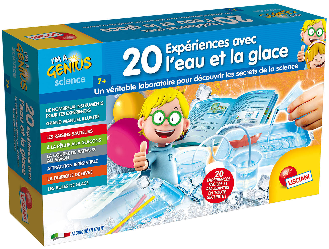 A real laboratory containing everything you need to perform 20 experiments with water and ice. All the experiments are easy, fun and help you understand some principles of physics and chemistry. The box contains special plastic containers, graduated glasses, test tubes, ice cube trays, balloons and much more! In addition, you will find a comprehensive illustrated manual.