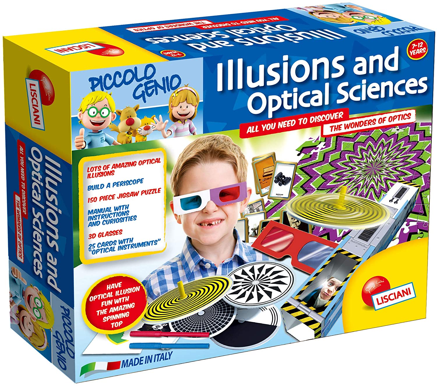 Genius Illusions and Optical SciencesDiscovering the secrets of opticsReproduces amazing effects – 3D cards and glasses – Plastic top – Optical cards – Let’s build a true periscope – Double-face puzzles – Ilustrated manual
