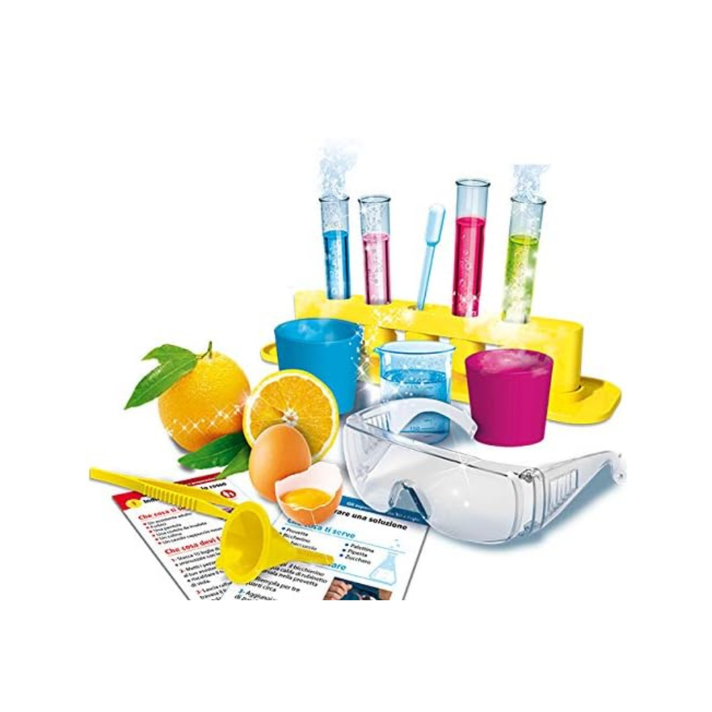 This kit contains more than 50 easy and safe experiments to try thanks also to all the accessories included in the package such as: plastic test tube holder, Regents, measuring cup, chemist’s diary, special cards, periodic table of the elements and much more.
