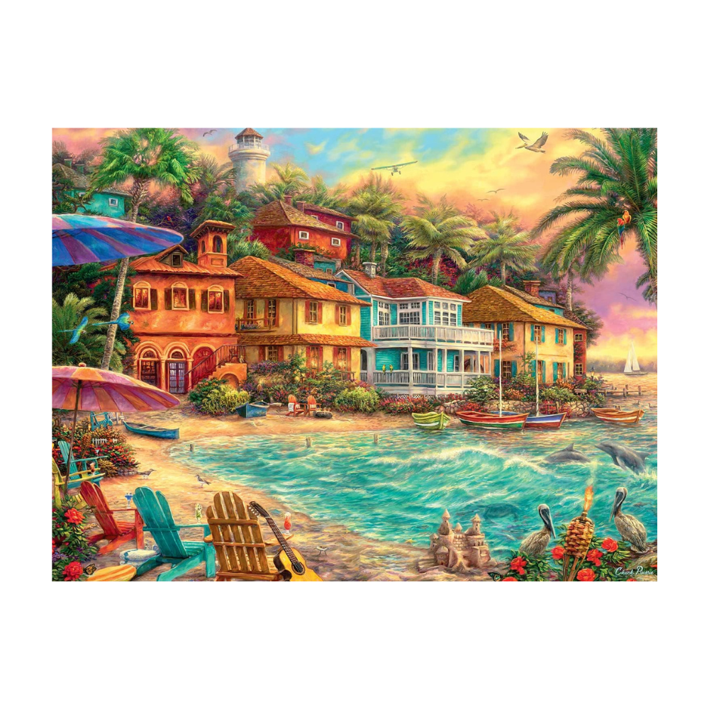 Island Time” is a 1500-piece jigsaw puzzle From the Art of Play Series by Buffalo Games based on Chuck Pinson’s artwork. Enjoy the beauty while putting together a relaxed beach town. Take a seat in an Adirondack chair on the beach or go swimming with the dolphins