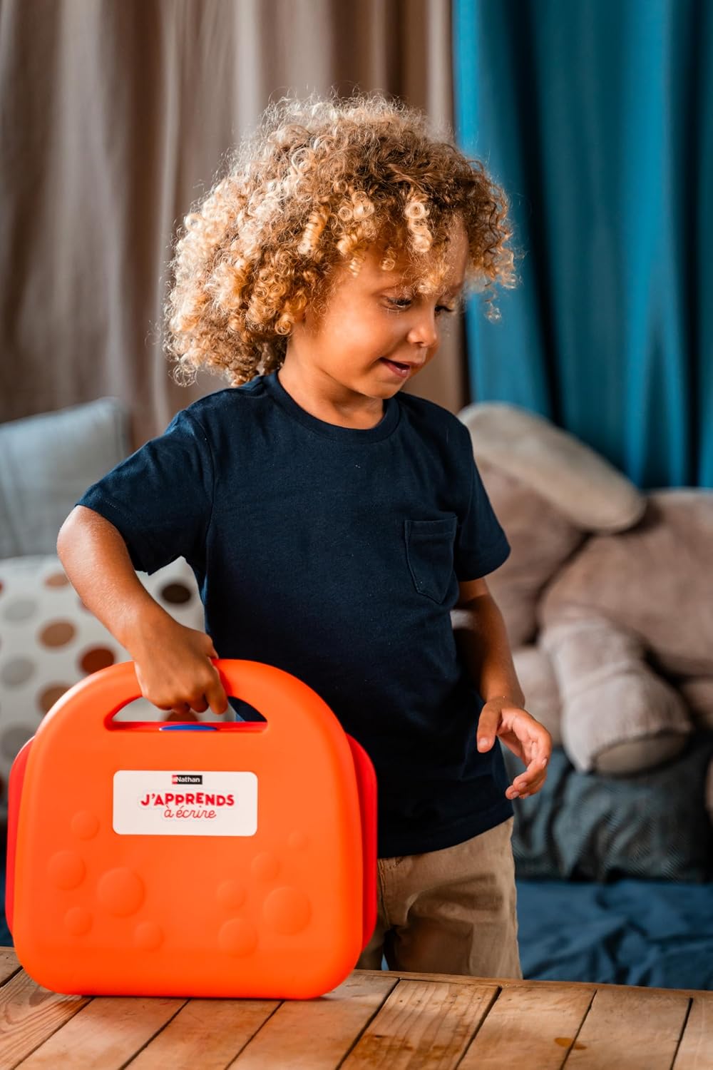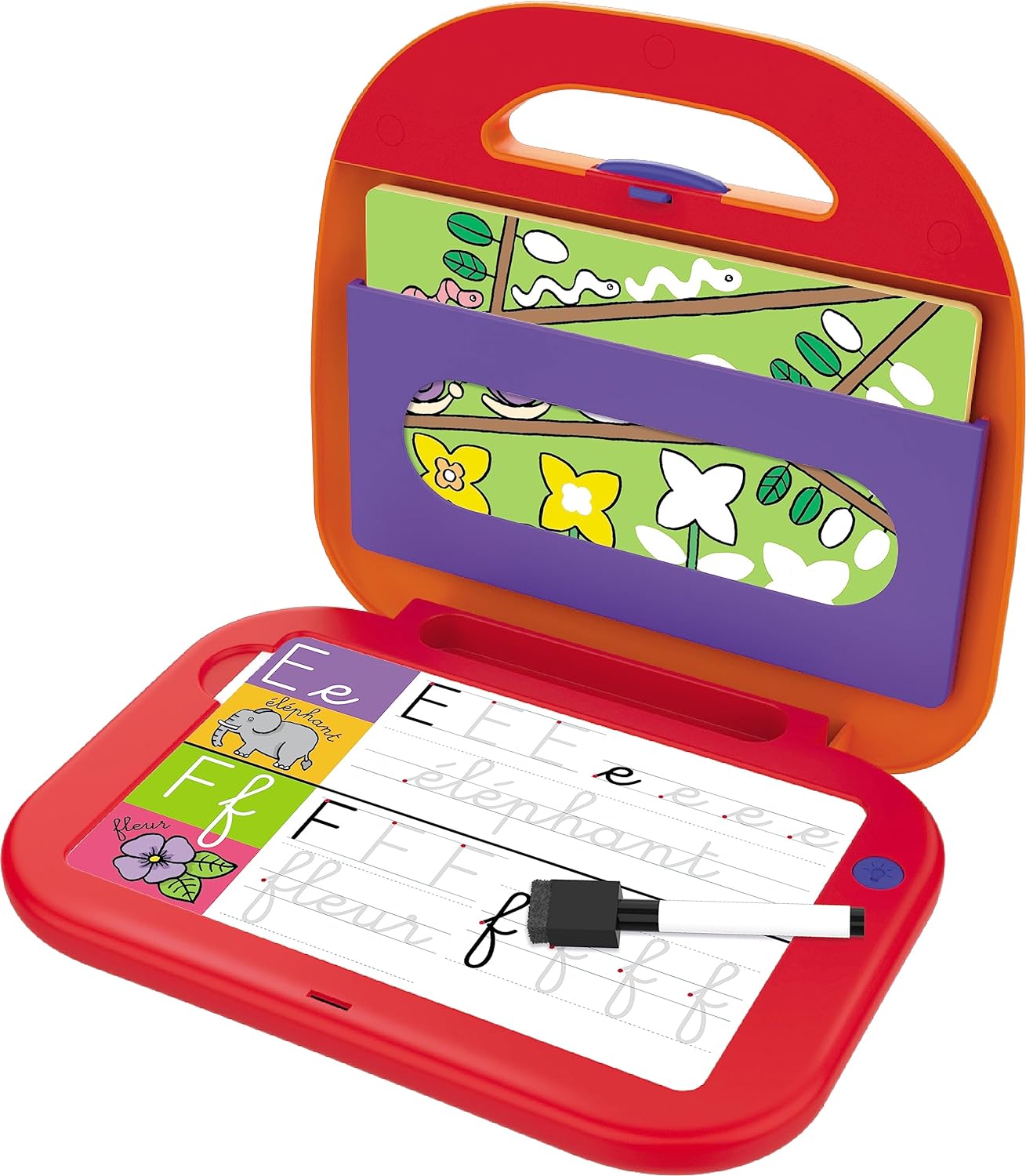 With this transportable suitcase, the child can practice the first gestures of writing; straight lines, waves, circles and the 26 letters of the alphabet. The 20 erasable boards and the light-up desk give him the model to write his first words and allow self-correction.