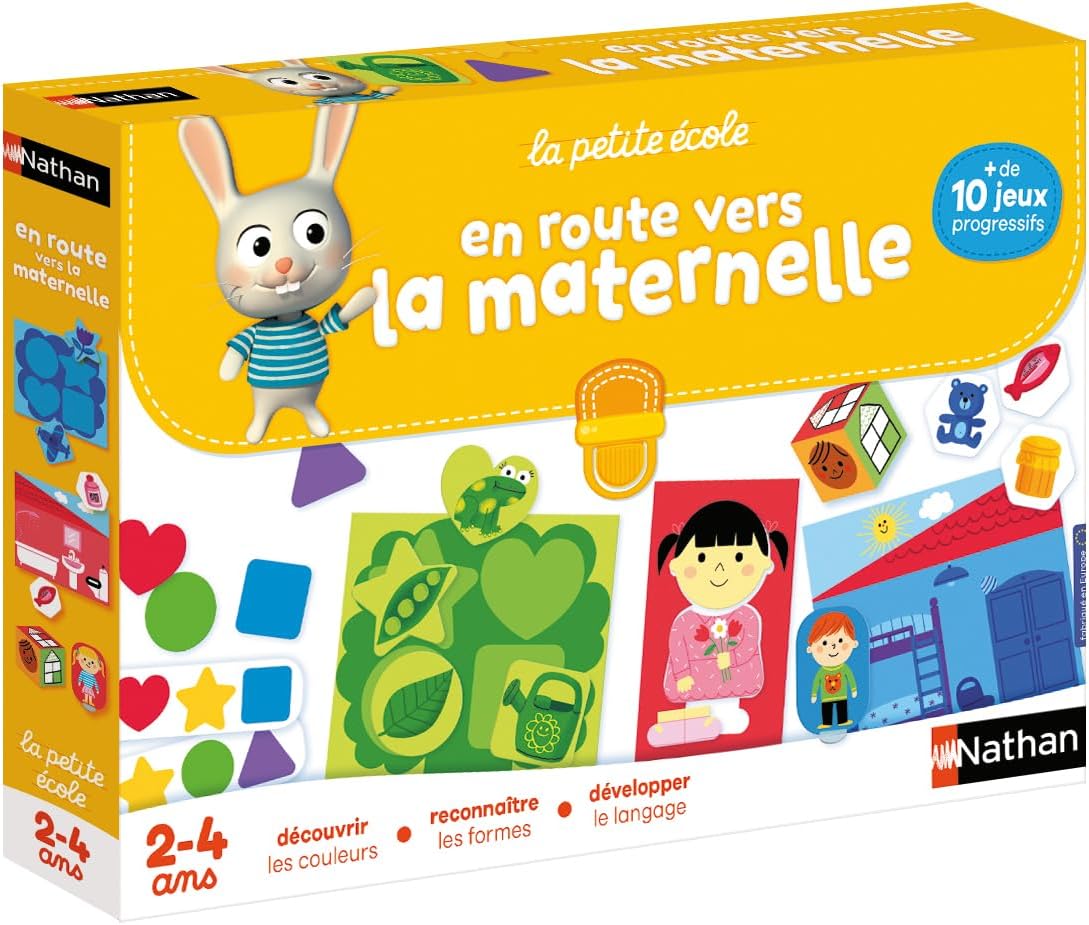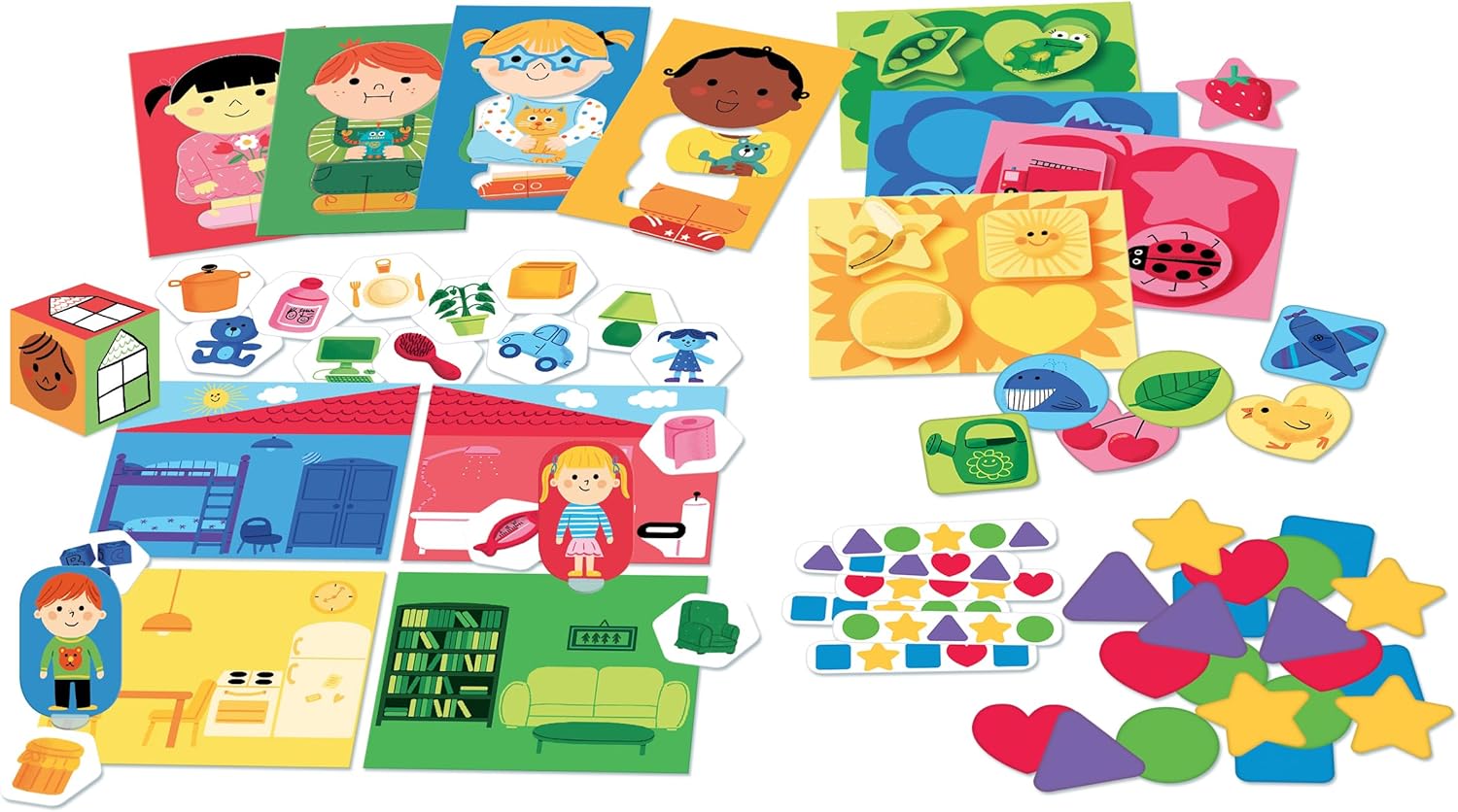 Contents of the box: The color lotto: 2 boards (21 x 18 cm) and 16 image tokens (7.5 x 8 cm) the color and shape sorting game: 7 instruction cards (25 x 5 cm) and 16 colored tokens (7.5 x 8 cm) the 4 friends game: 4 boards (21x 14 cm), 12 pieces to fit (head, body, legs) the big house game: 4 boards reconstituting the house (21 x 18 cm) and 16 object tokens (6.5 x 6.5 cm), 2 character tokens (7 x 5 cm, 2 plastic bases, 1 cardboard die (4 cm) and 1 game guide