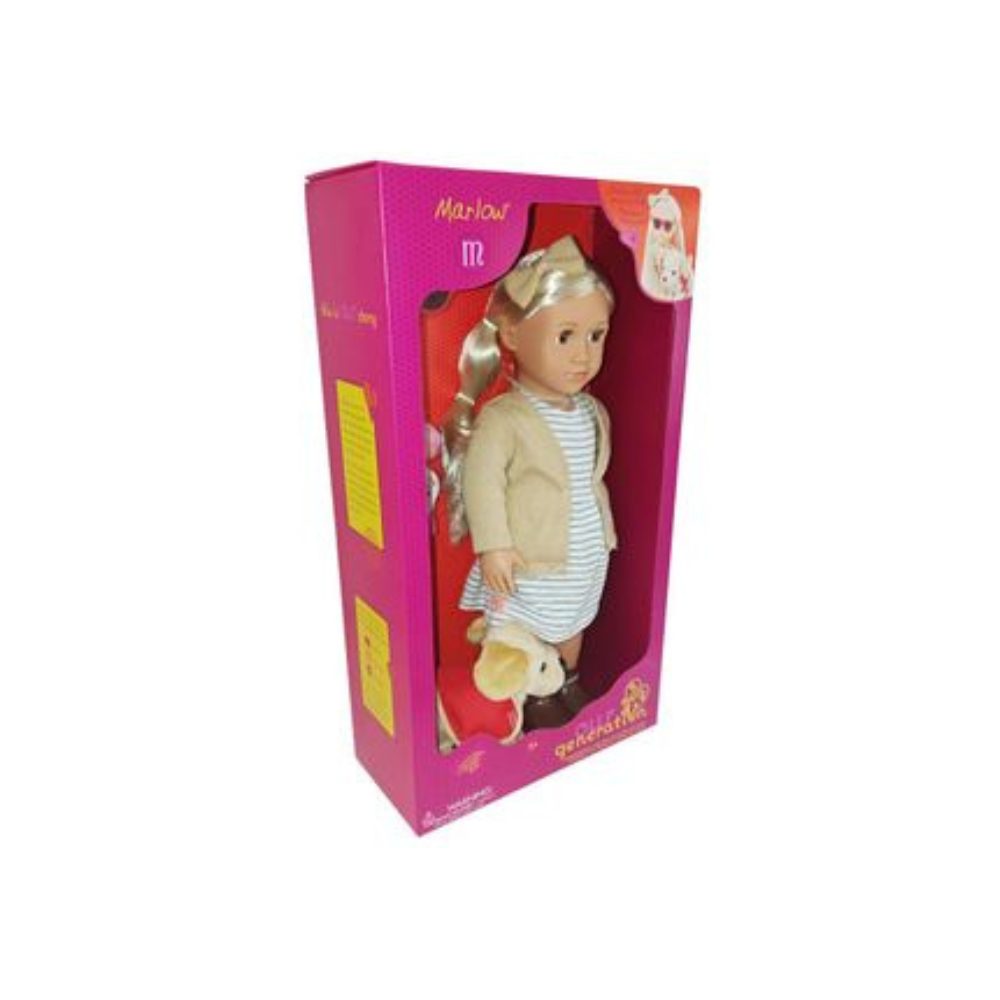 Meet the Our Generation 18-inch doll Marlow and her super cute guide dog! She has brown eyes that open and close, and her long blonde hair is lots of fun to brush and style. Marlow is visually impaired, and she relies on her loyal pal to help guide her around the town. When it’s time to head out, dress her pup in the bright red dog vest and harness. They comfortably fit all Our Generation plush dogs, so lots of best furry friends can help Marlow travel the OG neighborhood! Give Marlow an extra helping hand with the blind cane as she travels, and she can rotate her arms and legs to easily change outfits to match her adventures. She arrives in a cute striped dress with a long, trendy beige cardigan and matching booties. And her large hair bow accessory adds playful fun to her hairstyles! Her outfit also features easy-open closures to quickly put on and remove, so you can give Marlow many different looks every day! (Additional outfits sold separately)
