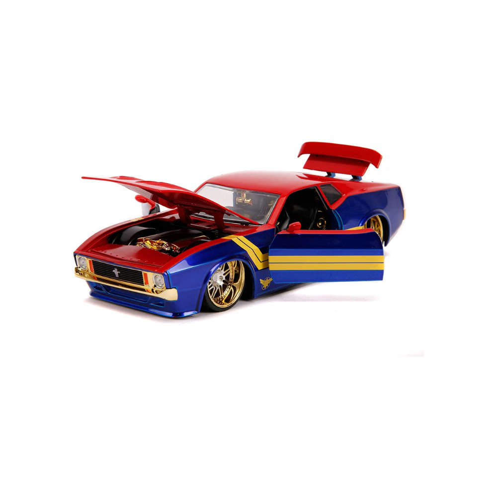 This 1973 Ford Mustang Mach 1 takes its styling cues directly from Captain Marvel and includes a 100% die cast CAPTAIN MARVEL figure. Each vehicle features opening doors, hood and trunk, along with a detailed interior. This beautifully sculpted collectible is sure to be a standout in any MARVEL collection.