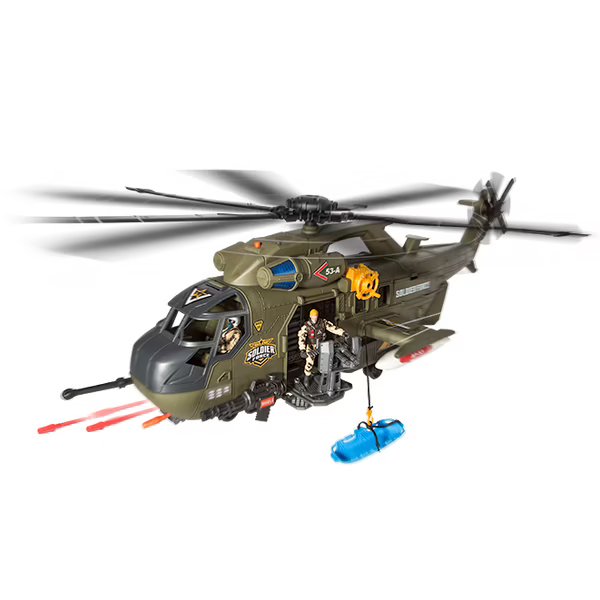 Military helicopter with 2 soldier figures and jeep