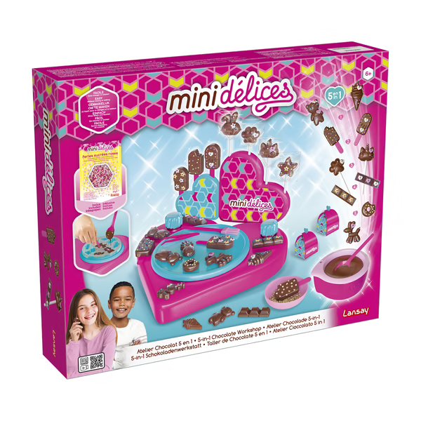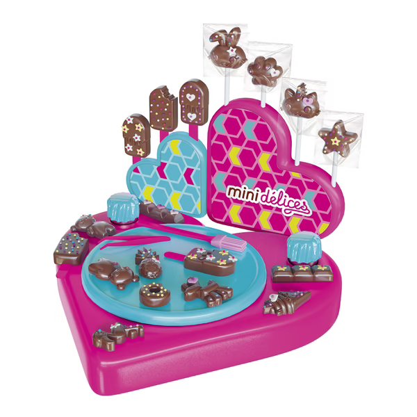 Colorful and easy to make mini gourmet creations without mixing or cooking! A complete workshop to easily create 5 types of chocolate treats : marshmallow bears, sticks, lollipops, chocolates and mini chocolate bars . Melt squares of chocolate using the hot water container. Then take mini sweet decorations or marshmallows, distribute them in the molds and pour the melted chocolate on top. You will obtain delicious chocolate creations that you can then arrange on the pretty heart-shaped displays or offer in the mini-packages included, and that’s it!The Mini Délices my super chocolate workshop 5 in 1 creation kit will stimulate your child’s creativity and imagination , and their sweet tooth !