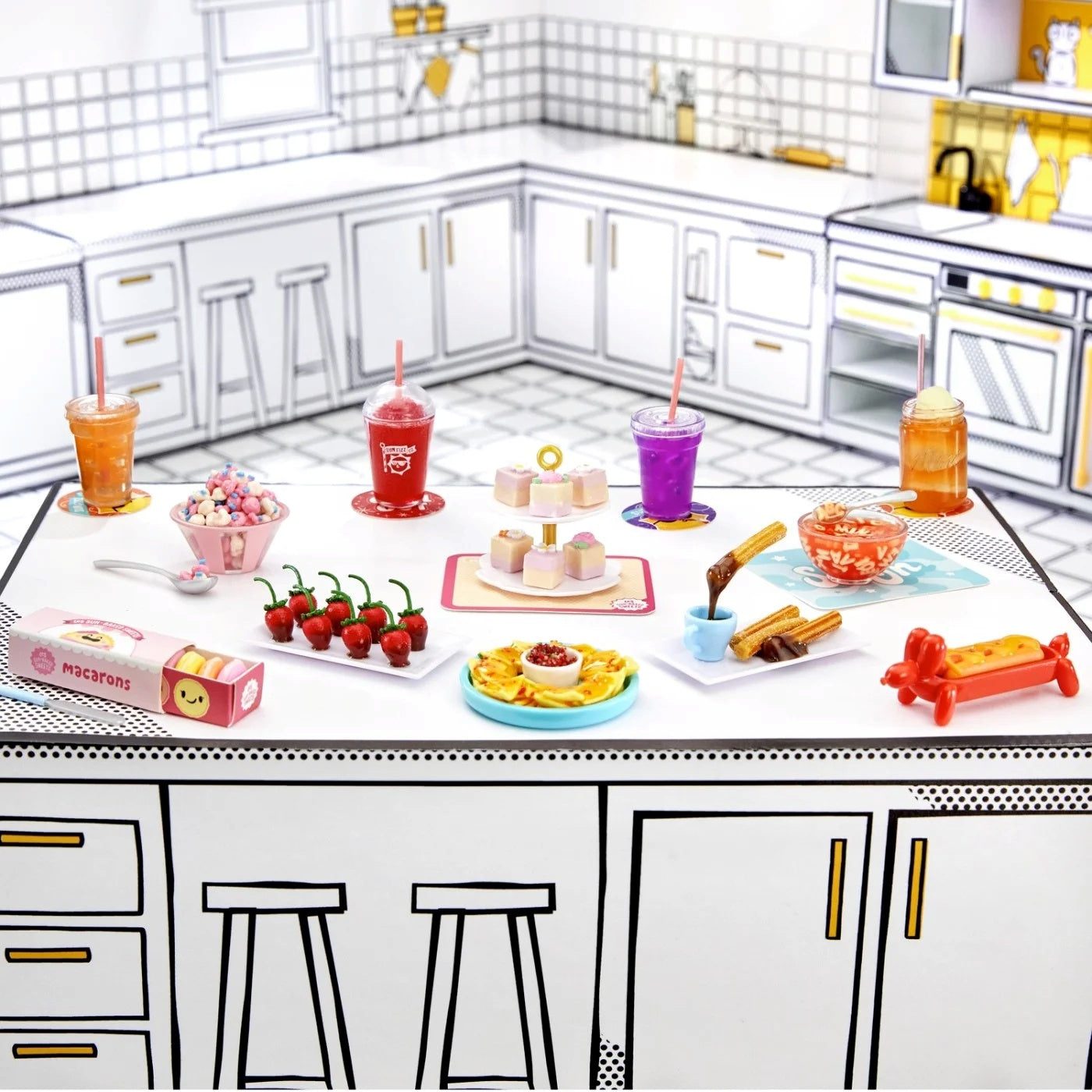 Each package is a SURPRISE, so you won’t know which mini you’re getting until you unpack it! Compare the contents of your package with the included collector’s guide to see which mini you received. Follow the recipe card on the back to make your mini. Once you’ve made your mini, put your replica under UV light until the resin hardens. Once the resin hardens, you will have a collectible that is ready to display! Collect all the collectibles from Series 2’s Make It Mini Food Café! Your finished replica isn’t the only thing fun to collect. The mini kitchen accessories and packaging are just as cute and collectible. From mini replica mason jars to nacho bags and fake soup cans, there are over 100 fake ingredients, packaging and kitchen accessories in the Make It Mini Food Series 2 to collect and create your own mini collectibles. DISCLAIMER: ingredients are NOT edible.