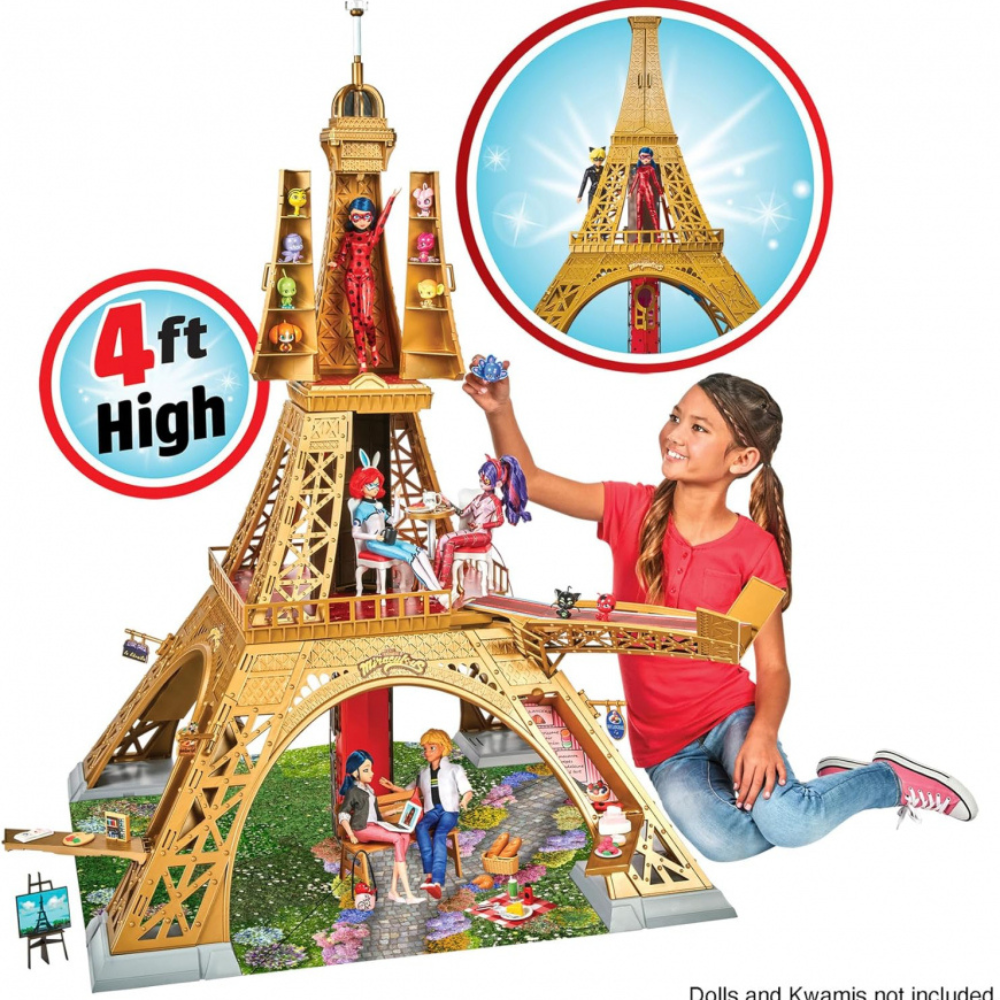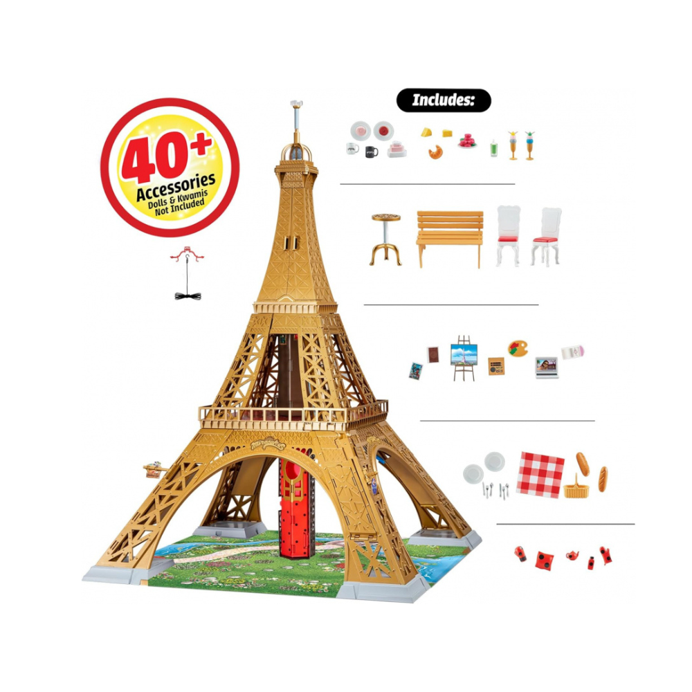 PARIS HEROEZ PLAYSET | Create your own Paris adventures with this amazing Miraculous Ladybug Dolls Playset for girls and boys. This incredible Miraculous toy is 50” tall with 3 levels of interactive fun, and is compatible with the 26cm Miraculous dolls range (DOLLS NOT INCLUDED AND SOLD SEPARATELY). GROUND LEVEL | At the base of the Miraculous Paris Heroez Playset is a wonderful picnic area for your Ladybug and Cat Noir toys to enjoy. Each leg of the tower folds out into a different hidden shop and the set comes with over 40 themed Miraculous accessories for your dolls to interact with. 2ND LEVEL | Marinette can take the lift up from the ground level to the second level while she transforms into the superhero Ladybug! Your Miraculous Ladybug toys can enjoy a bite to eat in the café, and then take in the view from the extendable balcony. 3RD LEVEL | At the top of this Miraculous Ladybug doll playset there is hidden storage for up to 8 Kwami companions that come with the Miraculous 26cm doll range, each sold separately. There is also an exciting zip-line so Ladybug can swing into action as a superhero to save the city of Paris. MORE MIRACULOUS TOYS | There is a large range of Miraculous Ladybug and Cat Noir girls toys and playsets to discover, from 26cm fashion dolls of all of your favourite characters, to role play dress up sets, to location and vehicle playsets, and even cuddly plush Kwamis you can take wherever you go.