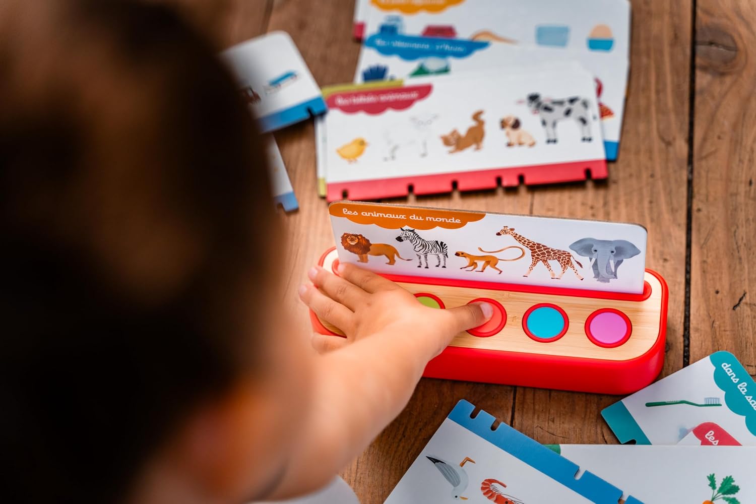 The child chooses a board, presses a button to listen to the word: the bird, tweet-tweet!