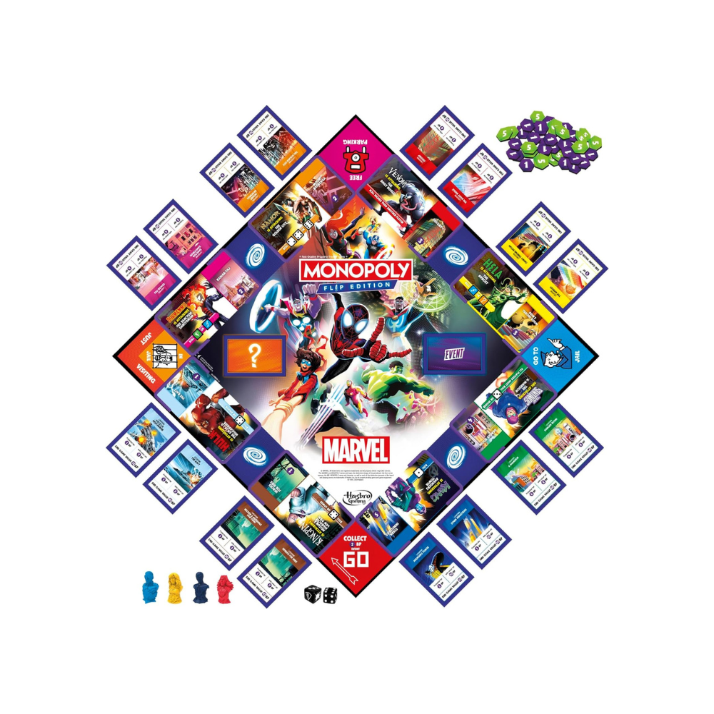 Time-traveling menace Kang is on the brink of conquering the Marvel Universe, and other Super Villains are capitalizing on the chaos. Playing as Captain America, Ms. Marvel, Spider-Man (Miles Morales), or Wanda Maximoff, players must team up with other Super Heroes to battle the villains, then flip gameboard tiles and race to secure the locations under attack.In this fun kids game, instead of earning money, players can earn cardboard Battle Point chips by collecting protection fees for their secured locations, teaming up with other heroes, and more. The player with the most Battle Points when all the locations have been secured wins!