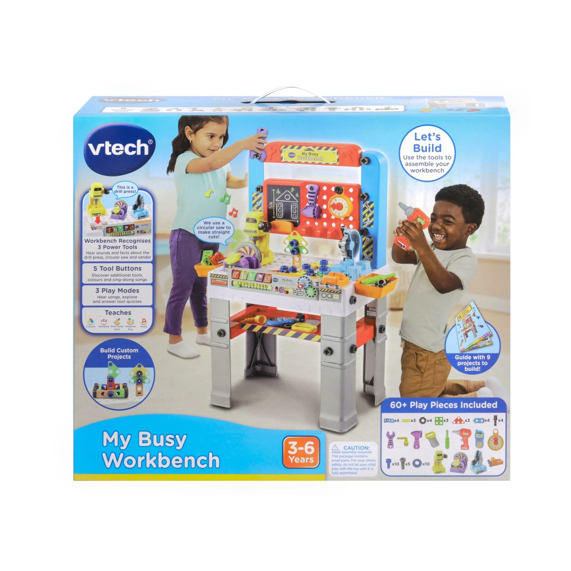 The Vtech My Busy Workbench is designed for little builders. It features three detachable smart tools that trigger fun responses. Smart tools: Pillar drill, sander, circular saw. 119 total pieces with 61 play pieces, including screws, nails, nuts, bolts, hammer, spanner, drill, screwdriver, saw and more. A double-sided six-page booklet provides instructions for nine build projects across three levels of learning, from 2D to 3D projects. Press the five light-up buttons on the panel for more fun role-play responses. It also comes with three modes of play, free play, adventure mode, quiz mode and music mode. The pack also includes storage for all of the tools and play pieces.