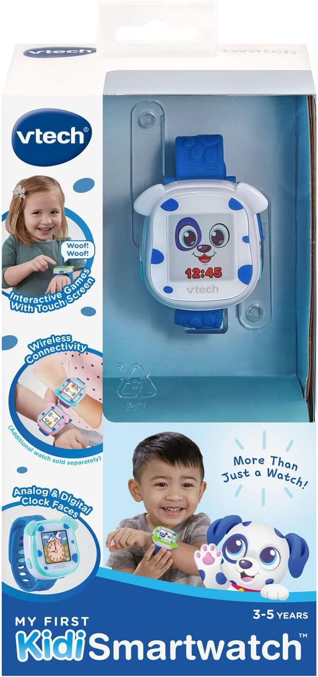 Get extra help with potty training by setting 30-, 60- or 90-minute reminders. Keep little smiles healthy with the Brush Your Teeth reminder or get them to sleep on time with a chime that tells them when to get ready for bed. Kids will love taking this digital doggie on all their adventures while learning a little responsibility along the way. Give the pup a name and care for them right on screen. This super-talented pup can even be taught to do 20 tricks and will celebrate with barks and confetti. Explore the Time Master app and choose from 20 digital and analog clock faces. Connect watch-to-watch with a friend who also has a My First Kidi Smartwatch™ (sold separately) for more games and activities. Intended for ages 3-5 years. Rechargeable battery and micro-USB cable included.