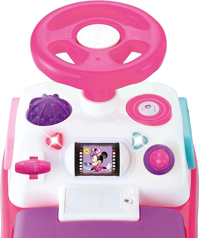 The Disney Minnie Mouse My First Activity Ride On is perfect for tots on the move. Toddlers aged one to three will love scooting about on this sturdy ride on toy, It features lights, sounds and pictures of Minnie Mouse. Why we love the Disney Minnie Mouse My First Activity Ride On: flashing signal lights, beeping horn and revving engine sounds, moveable steering wheel, ignition key and gear shift, educational clock face and a peek a boo window. My First Minnie Ride On uses two AA batteries which are included.