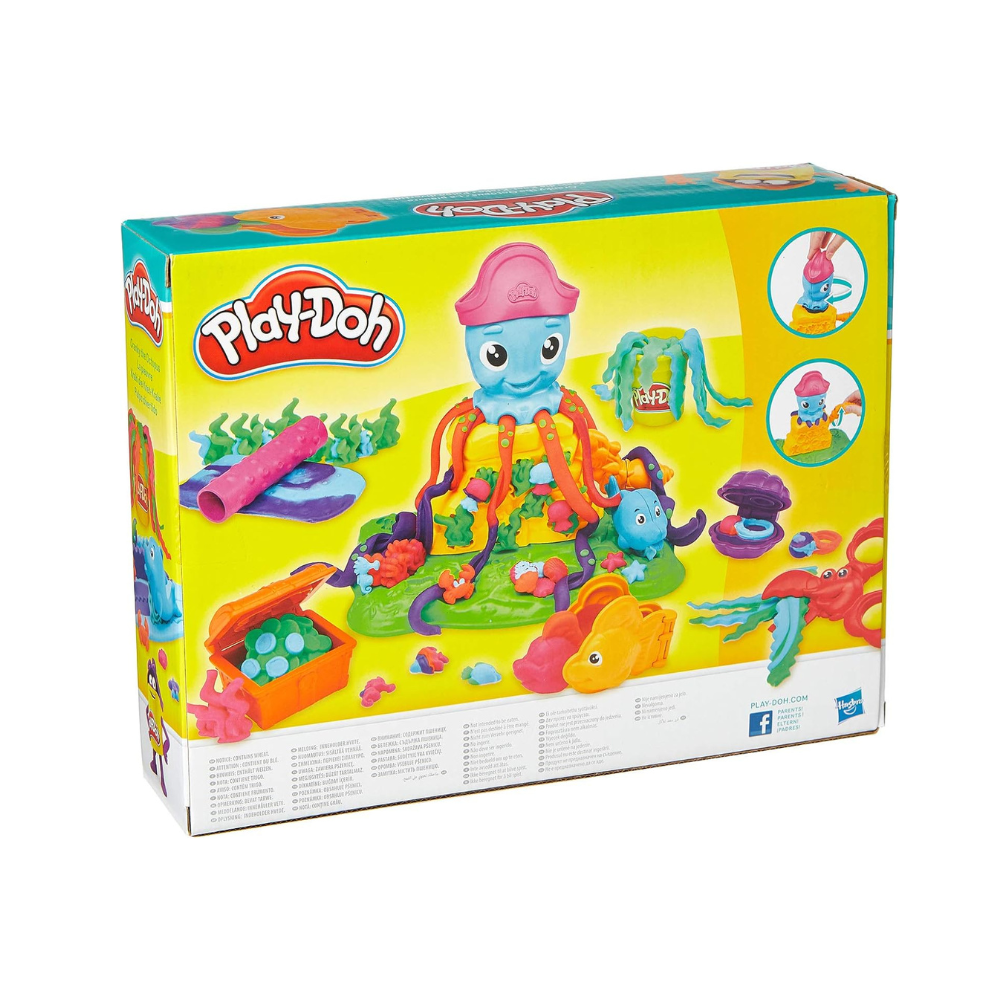 This Play-Doh set includes a treasure chest and clamshell reveal molds for treasures inside. Textured roller imprints coral reef textures into Play-Doh compound