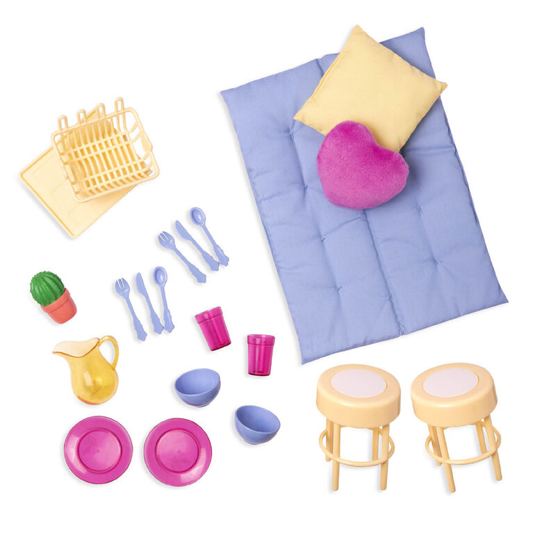 This sturdy camping trailer will be a second home for your travelers on the road. Fully equipped with all the comforts, your dolls can cook up some fun in the kitchen. It features a mini fridge, sink, and opening stove, and they can keep everything neatly organized with the storage shelves! The table top easily slides out for more dining space, and you can set up the 2 stools outside the camper to enjoy delicious meals in the fresh air! When it’s time to rest for the night, grab the soft mattress and fold out the dining bench to create a comfy bed – it’s the perfect size for your dolls to dream sweet dreams. The rolling trailer also includes a hitch that easily attaches to the Our Generation My Way & Highways 4×4 vehicle, so your dolls can set up their campsite all over the world!