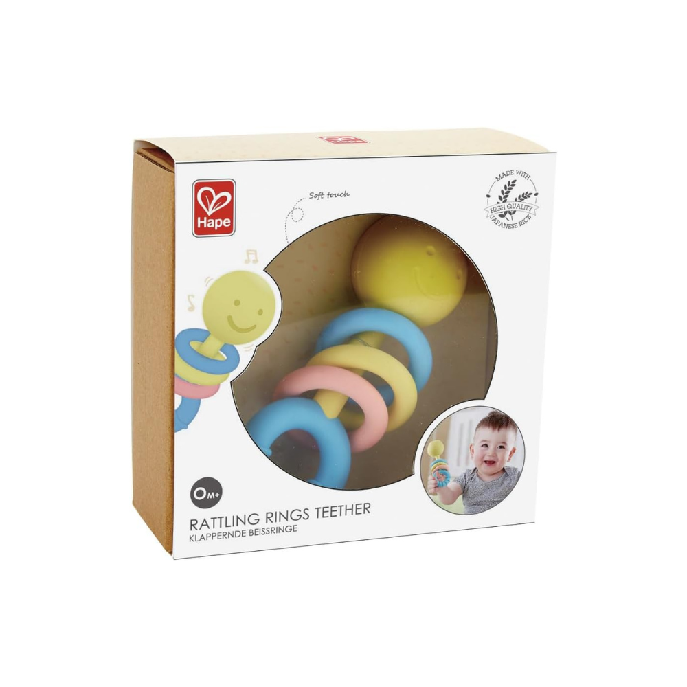 Designed for little hands to grab and hold, the cute Rattling Rings Teether is great to help your little one take those first sensory steps. The softly-colored rings rattle gently when shook which immediately gets your babys attention. The teether ring at the bottom is covered with soft TPE, making it perfect to bite and chew helping those first teeth come through.