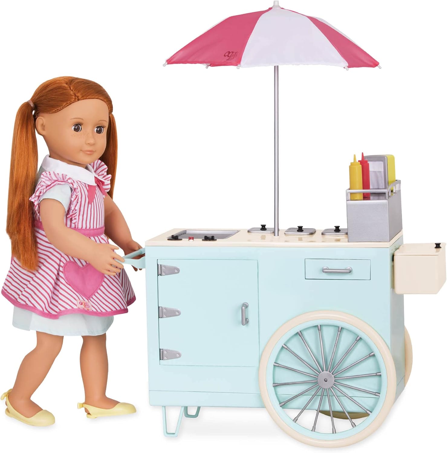 The perfect snack-stop for the boardwalk, the beach, or the ballgame, this hot dog cart is dishing out all kinds of delights!Watch the red light go on when you turn on the rotating grill to show that it’s hot.” Once the hot dogs are cooked