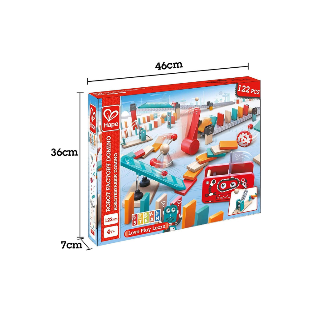* DOUBLE-SIDED TRACK: Hape¡¥s Robot Factory Domino set includes two double-sided ball tracks, which feature a normal track and a zig-zag track. A fun-filled wooden toy for children ages 4 and up* EXCITING KIDS TOY: The catapult launches a wooden ball through the air, adding drama and spectacle to the trail. A finishing flag raises up for a dramatic ending as your last domino falls* WATCH THE DOMINO EFFECT: Put a wooden ball in the rail car and release it down the ramp. As the car tips over, the ball is released and starts the domino effect Momentum flows through the spinning and gravity release arm, and finally into the third wooden ball* EDUCATIONAL GAME: Using the STEAM value, the robot factory domino set introduces children to the concepts of potential energy, momentum and gravity.* ALL ACCESSORIES INCLUDED: Includes five connectors, five double-sided ball tracks, one see-saw, one momentum wheel, one spinning arm, one gravity release arm, one finish flag box, one tunnel, one tipper car, four three wooden balls, one marble, one special domino, one half domino, two tall dominoes, two medium dominoes, and 93 standard dominoes