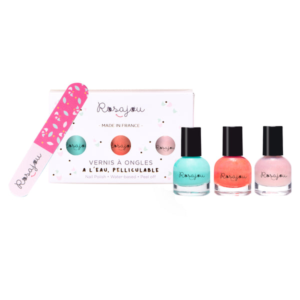 Rosajou nail polishes set lagon x corail x ballerine + nail file is an adorable box of 3 nail polishes for children.