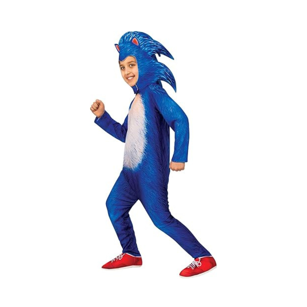 Child’s Sonic deluxe costume jumpsuit and headpiece with printed hair design, attached shoe covers, and gloves