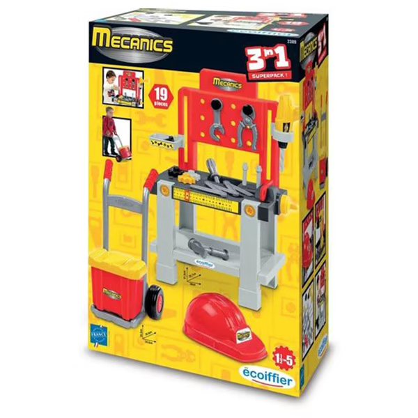It contains a workbench with drill, wrench, pliers, hammer screwdriver, tape measure, a hand truck with its storage box and a helmet.