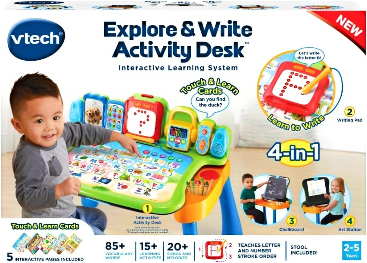 Touch, draw, learn and write on the Touch & Learn Activity Desk.Big touch panel learning desk with a stool.Light up writing pad with stylus for letter & number writing.Features 1 interactive desktop and 8 colourful interactive touch pages that introduce letters, phonics, numbers, body parts, animals, music, people, seasons, and more. Each includes 3-4 learning activities.Toy phone teaches greeting phrases with pretend play games.Music player plays 20+ fun pop & classical songs.LED display screen for fun animations.Easy transformation to easel and blackboard.