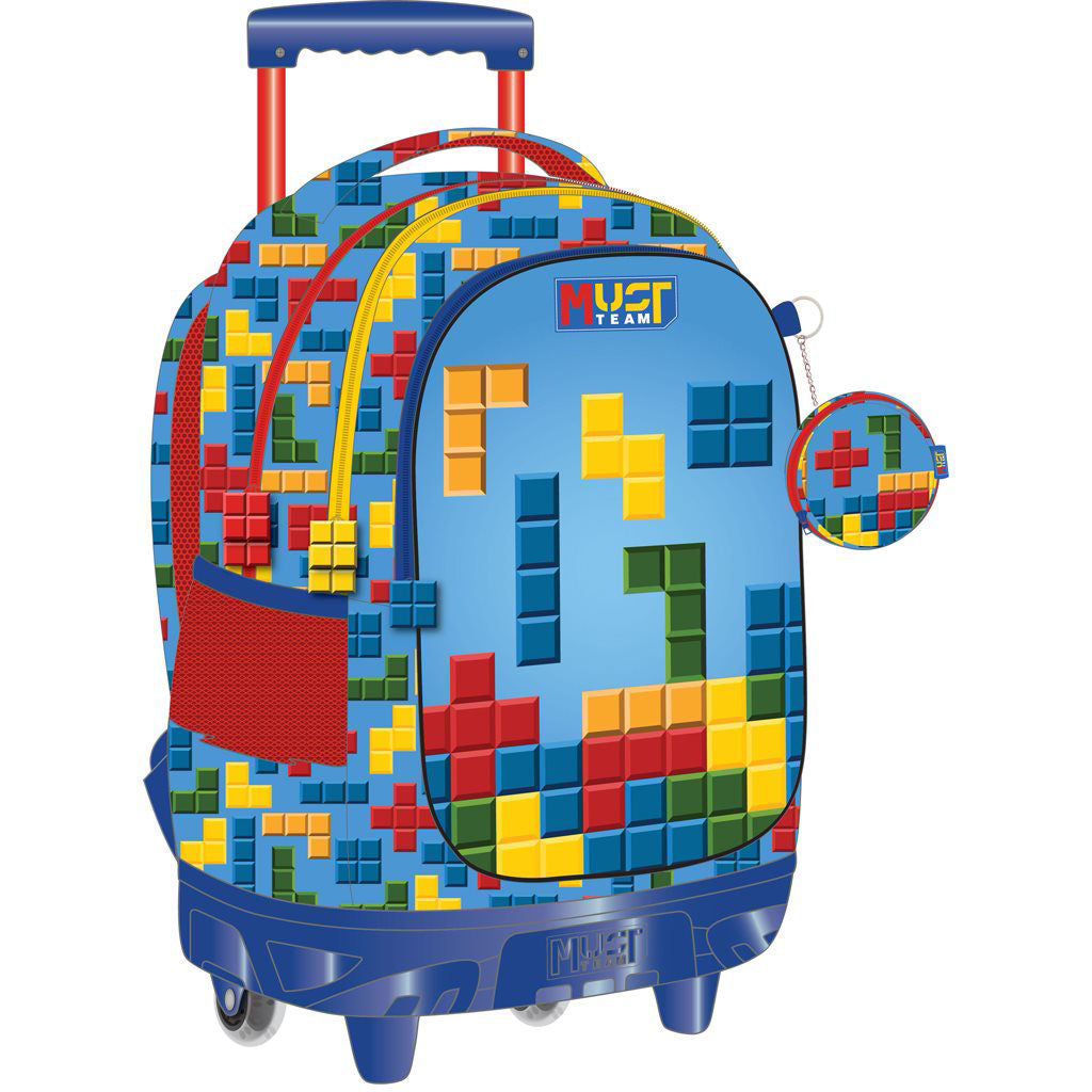 School Trolley Backpack Must Team Trolley Bricks 3 Cases in impressive good vibes designs and PVC tins with sequins! Practical and durable school bag with ergonomic design for safe, comfortable and easy transport of all necessary school supplies to school. A special elementary school bag that combines a backpack and a trolley together!