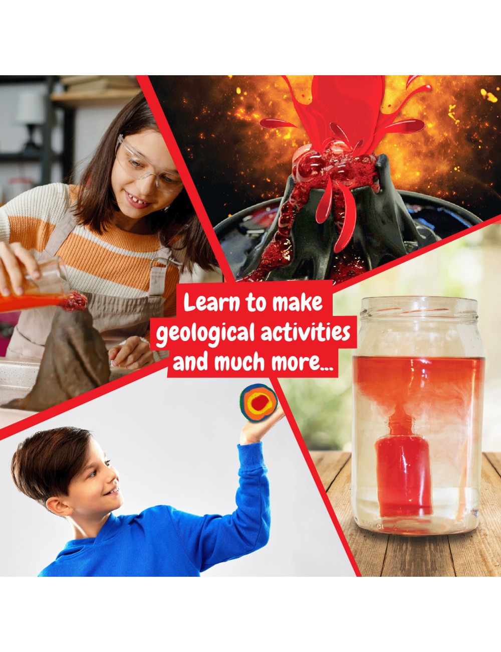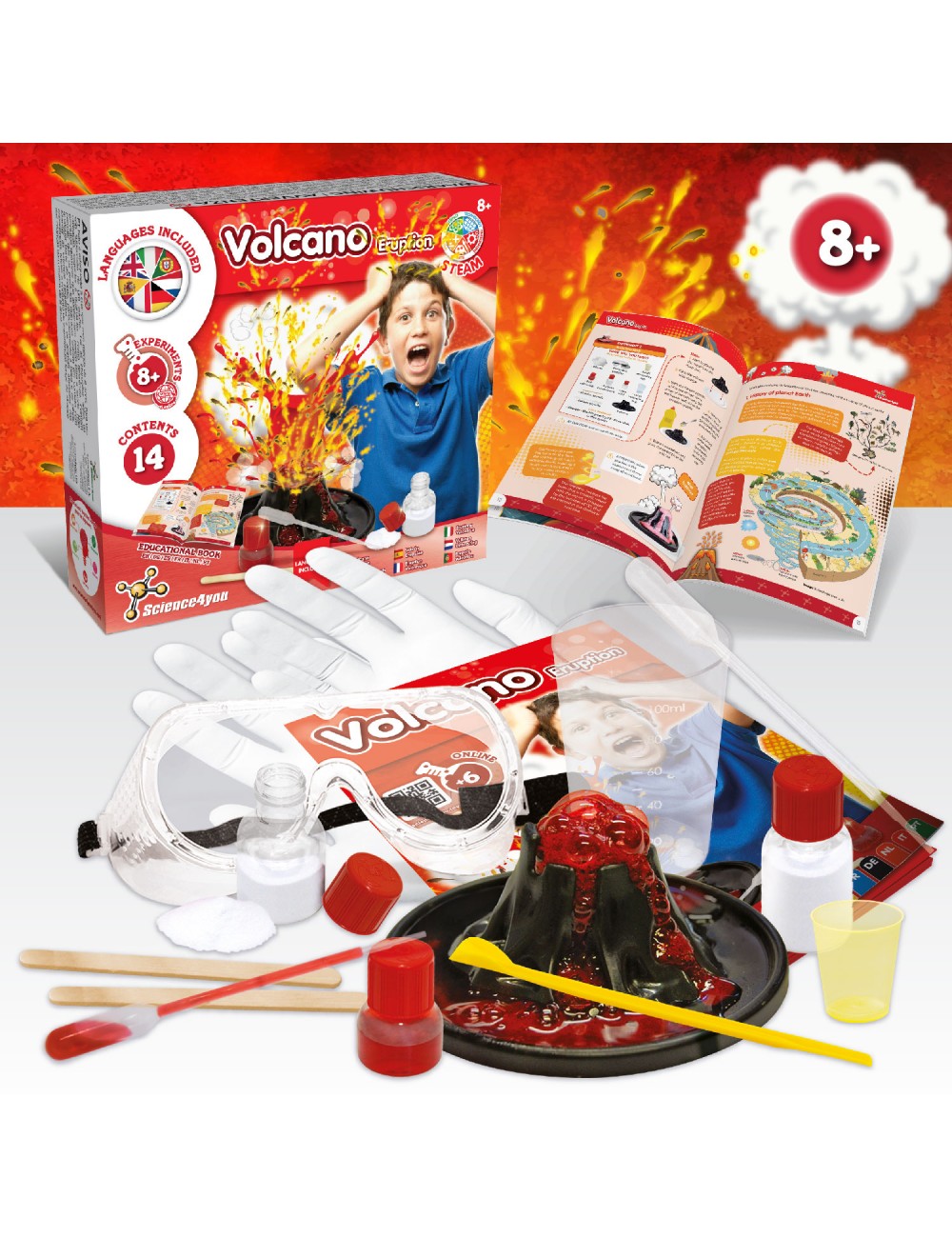 With this science kit for kids, you can find volcanic adventures! Discover how to simulate a volcanic eruption and how to create sticky lava with the scientific experiments in this chemistry lab.Make amazing realistic and colorful volcanic eruptions with the experiments and crafts in this science kit for kids. You can also learn about the science of different types of lava and volcanic eruptions and how and why they happen.This science kit for kids includes an educational book in 7 languages (Spanish, English, French, German, Italian, Dutch and Portuguese) to teach you everything about science in the world of volcanoes.This is a chemistry and science lab for kids 8 years old inspired by the STEAM methodology (formerly known as STEM toys). STEAM stands for Science, Technology, Engineering, Arts and Mathematics. These scientific and educational toys help children acquire knowledge in these 5 areas, stimulating their skills while playing.