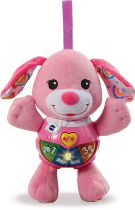 A soft little dog for musical cuddles! With 3 light-up buttons to discover the first numbers, new words, songs and trigger melodies. Kiss sound effects. Different textures to awaken Baby’s curiosity: plastic body, head and paws in soft fabric and ears in satin fabric. It is suitable for children from 3 months to 2 years. Demonstration battery included