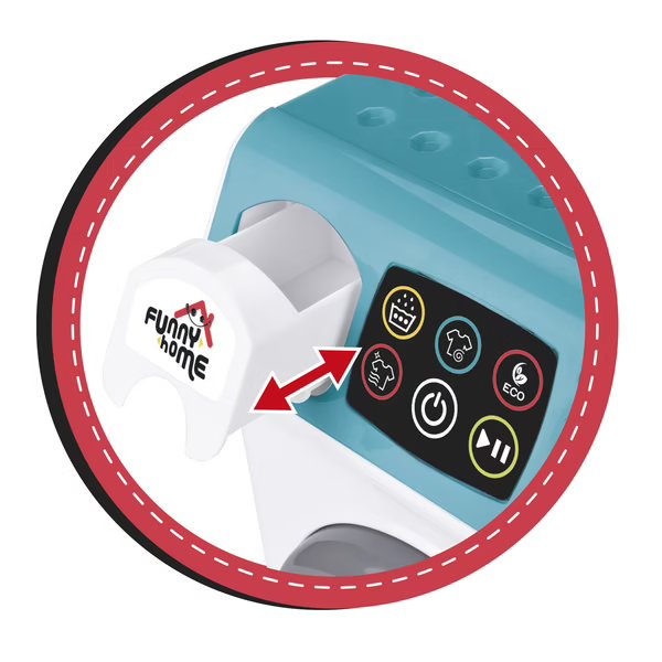 The washing machine reproduces the operation of real washing machines: button with on/off function to activate washing, detergent basket that can be opened, 4 washing programs , rotating basket.